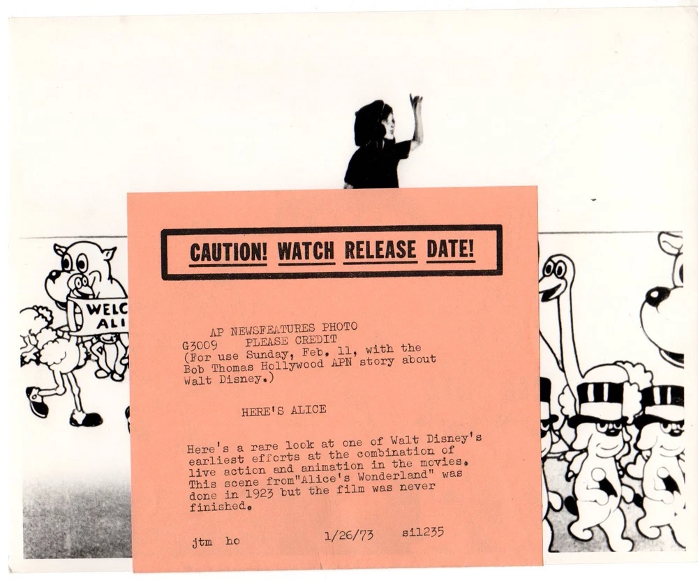 Vintage 8 x 10 in. US single-weight glossy copy photograph ( not a vintage original photograph) from the 1920s animated and live-action silent film comedy, ALICE'S WONDERLAND , released in 1923 by Margaret J. Winkler and produced by Laugh-O-Gram Films. The image depicts a live-action shot of young Alice (Virginia Davis) as she rides atop an animated elephant, with other animated characters around them, which was a great achievement at the time. This copy photograph was used for publicity purposes in 1973 and features a paper snipe on the verso which folds over to the front. It is in fine+ condition as shown. Provenance: The Hearst Herald Examiner newspaper archive . Alice visits an animation studio, where the animators show her various scenes on their drawing boards. A few of them: a cat dancing to a cat band; a mouse poking at a (live) cat until it moves; a couple mice boxing, while the animators crowd around cheering and acting as corner-men. That night, she dreams of taking a train to cartoon-land, where a red carpet reception awaits. She appears in live action. They have a welcoming parade, with Alice riding on an elephant. The cartoons dance for her, and she dances for them. Meanwhile, the lions break out of the zoo. The lions chase her into a hollow tree, then into a cave and down a rabbit hole. Finally, she jumps off a cliff and awakes back in her bed.