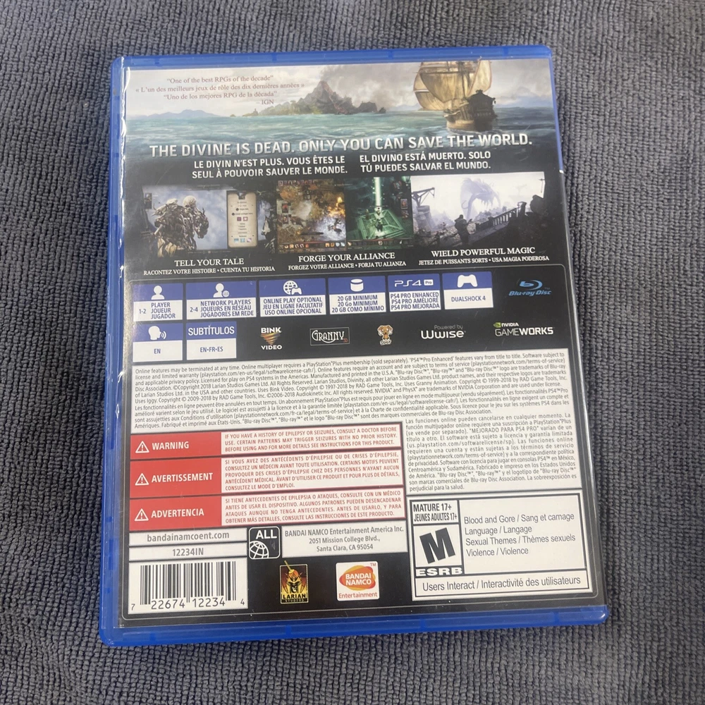 gtin13:0722674122344Region Code:Region FreeGenre:Action & Adventure, Battle, Role PlayingPlatform:Sony PlayStation 4UPC:0722674122344Rating:MPublisher:NAMCOGame Name:Divinity: Original Sin 2-Definitive EditionMPN:12234Video Game Series:divinity