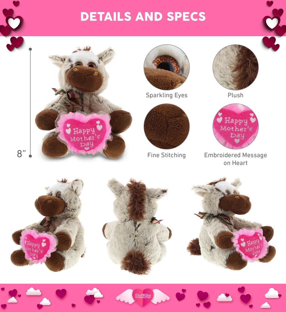 DolliBu Happy Mother's Day Super Soft Plush Floppy Donkey Figure - 8" Inches DESCRIPTION Surprise your loved one with a sentimental plush this Mother's Day to make their day extra special. Gifting a plush donkey with a "Happy Mother's Day" message is a cute way to express your love. Surprise your mom with the perfect gift! Super soft & adorable plush will make the perfect addition to flowers, gift box, or with a dozen of roses, chocolates or bottle of champagne. Donkey Plush comes customized with a beautiful "Happy Mother's Day" message embroidered on a Plush Heart. DolliBu's Mother's Day Plush Super Soft Floppy Donkey makes a sweet present for anyone who loves cute stuffed toys and adorable farm animals. A must-have cute plush gift to celebrate and make your mom feel special on Mother's Day. The novelty donkey plush toy designed with super soft plush and fluffy fur is a sweet plush gift for your loved one. Let your mom, daughter, girlfriend, wife or grandma know that you love them by giving them a cute plush animal with an embroidered pink pillow heart wishing them a Happy Mother's Day. It is also a fun addition to their room to remind them that you love them. Includes 1 DolliBu Super Soft Plush Floppy Donkey stuffed heart toy with a sentimental message. The donkey plush animal comes with a pink stuffed heart attached featuring a beautifully embroidered "Happy Mother's Day" message. Decorated with a body that is made of soft fabric that makes the plush perfect for cuddles & snuggles. Super Soft Plush Floppy Donkey doll is a toy plush, made from premium quality polyester & stuffed with soft fillings. Covered with brown and beige fluffy fur. A snuggly and cozy farm animal toy crafted with durable materials, designed to deliver a Happy Mother's Day message to your loved one in an adorable way. To maintain the cleanliness of the donkey plush, surface wash with cold water & allow to air dry. This cute floppy donkey plush toy measures 8" inches long. PRODUCT SIZE 8 inches PRODUCT FEATURES THE SUPER SOFT FLOPPY DONKEY STUFFED ANIMAL WITH A HEART COMES WITH UNIQUE DESIGN YOU WILL LOVE – Donkey Plush comes customized with a beautiful "Happy Mother's Day" message embroidered on a Plush Heart. DolliBu's Mother's Day Plush Super Soft Floppy Donkey makes a sweet present for anyone who loves cute stuffed toys and adorable farm animals. A must-have cute plush gift to celebrate and make your mom feel special on Mother's Day. THE FLOPPY DONKEY PLUSH TOY IS FOR ANYONE WHO LOVES STUFFED ANIMALS - The novelty donkey plush toy designed with super soft plush and fluffy fur is a sweet plush gift for your loved one. Let your mom, daughter, girlfriend, wife or grandma know that you love them by giving them a cute plush animal with an embroidered pink pillow heart wishing them a Happy Mother's Day. It is also a fun addition to their room to remind them that you love them. INCLUDED WITH THE PURCHASE - Includes 1 DolliBu Super Soft Plush Floppy Donkey stuffed heart toy with a sentimental message. The donkey plush animal comes with a pink stuffed heart attached featuring a beautifully embroidered "Happy Mother's Day" message. Decorated with a body that is made of soft fabric that makes the plush perfect for cuddles & snuggles. This cute floppy donkey plush toy measures 8" inches long. HIGH-QUALITY TEDDY BEAR WITH HEART - Super Soft Plush Floppy Donkey doll is a toy plush, made from premium quality polyester & stuffed with soft fillings. Covered with brown and beige fluffy fur. A snuggly and cozy farm animal toy crafted with durable materials, designed to deliver a Happy Mother's Day message to your loved one in an adorable way. To maintain the cleanliness of the donkey plush, surface wash with cold water & allow to air dry. IDEAL USE FOR SUPER SOFT PLUSH DONKEY MOTHER'S DAY STUFFED ANIMAL - Surprise your loved one with a sentimental plush this Mother's Day to make their day extra special. Gifting a plush donkey with a "Happy Mother's Day" message is a cute way to express your love. Surprise your mom with the perfect gift! Super soft & adorable plush will make the perfect addition to flowers, gift box, or with a dozen of roses, chocolates or bottle of champagne. PAYMENTS SHIPPING RETURNS