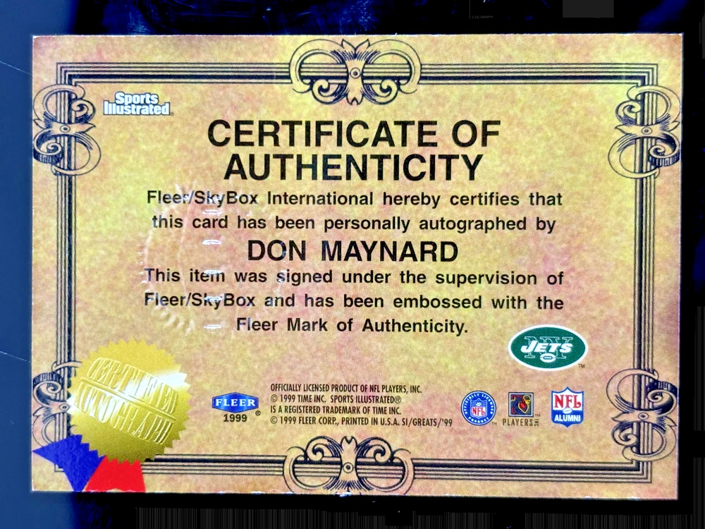 Don Maynard 1999 FLEER Greats of the Game On Card Auto Autograph SP JETS NFL HOF