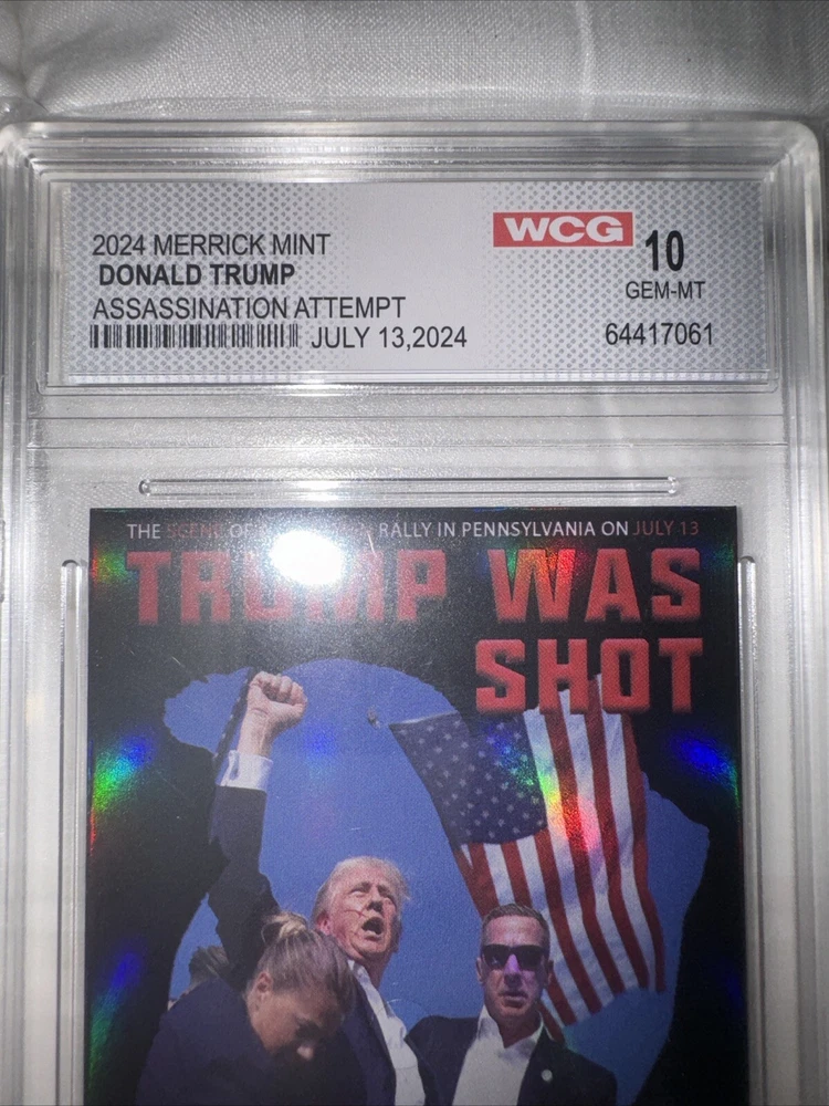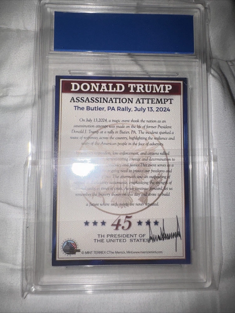 This Donald Trump 2024 Assassination Attempt Trading Card is a must-have for any collector. Graded GEM-MINT 10, this original card stock is of the highest quality and features the iconic former president in a thrilling action-packed design. With a card thickness of 35 Pt., this non-sport trading card is perfect for fans of superhero, action, adventure, crime, war, comedy, mystery, political, history, and military genres. The card is in standard size and is suitable for ages 8 and up. It is an original licensed reprint and was manufactured in the United States. The card features the assassination attempt on Donald Trump and is a perfect addition to any collection.