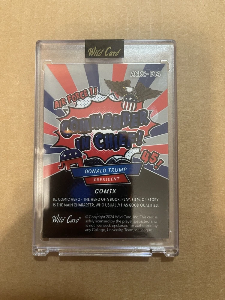 Graded: No Set: Election Autographed: No Manufacturer: Wild Card Year Manufactured: 2024 Character: Donald Trump Franchise: US Presidents Features: Serial Numbered, Short Print Type: Non-Sport Trading Card Featured Person/Artist: Donald Trump Parallel/Variety: Commander In Chief