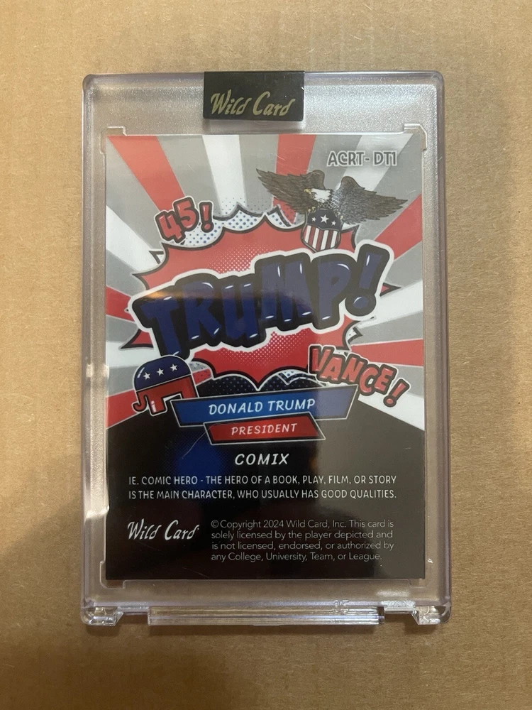 Franchise: US Presidents Set: Election Features: Serial Numbered, Short Print Year Manufactured: 2024 Character: Donald Trump Autographed: No Parallel/Variety: Commander In Chief Featured Person/Artist: Donald Trump Graded: No Type: Non-Sport Trading Card Manufacturer: Wild Card