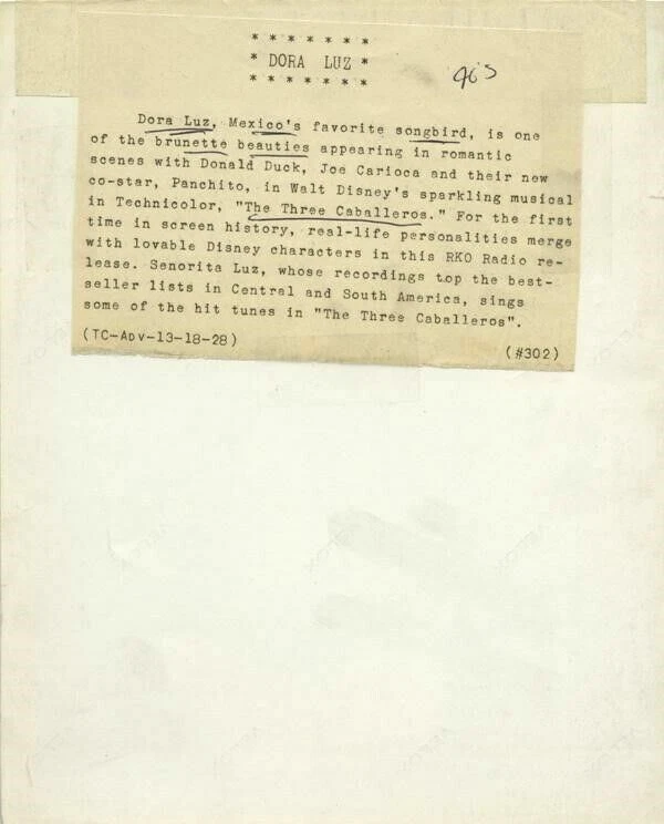Dora Luz Breathtaking Glamour Pose Disney's Three Caballeros 1944 Original Photo, Absolutely stunning portrait of the glamorous Mexican singer and actress in a publicity pose for Walt Disney's classic movie. VG Condition (minor edge wear and creases) This item is an ORIGINAL 8x10 photo from the historic archives of Silver Screen Mementos. This original photograph was made in the actual year the film, television show or event was produced. The movie studios produced publicity photographs for distribution to the press, photo agencies and publicity departments to advertise the film/tv show or event. Very often original photos have press release information on the reverse of the photo - movie credits, description of the scene, event and people involved. This is a historic piece of cinema art and is being offered from one collector to another, no rights given or implied. Silver Screen are gradually releasing thousands of Original Photographs, Transparencies, Negatives, Lobby Cards, Posters, Magazines and other memorabilia from our historic archive. Powered by SixBit's eCommerce Solution Listing and template services provided by inkFrog