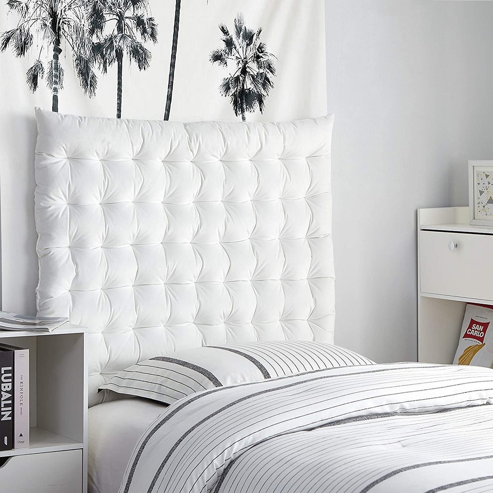 Upgrade your bedroom décor with the Rainha Cushion Tufted College Headboard. The thick, cushioned fill and soft, velvet exterior create a cozy and stylish addition to any personal sanctuary. This headboard comes with two sets of straps to attach it to your bedframe or four loops to hang it on the wall, giving you the flexibility to choose your preferred setup.Features: Includes 1 Twin / Twin XL classic pillow-style headboard (bed not included) Available in multiple colors to best match your bedroom or dorm décor Luxe, plush vibe with thick cushioned fill provides both style and comfort 2 sets of 12-inch-long fabric ties secure headboard to your Twin / Twin XL bed frame 4 fabric loops on back allow headboard to mount to wall Dimensions: 39.25 inches W x 34 inches H x 3.15 inches Free Shipping Over $49.99* Details Rainha® Cushion Tufted College Headboard by DormCo Product Description: Upgrade your bedroom décor with the Rainha Cushion Tufted College Headboard. The thick, cushioned fill and soft, velvet exterior create a cozy and stylish addition to any personal sanctuary. This headboard comes with two sets of straps to attach it to your bedframe or four loops to hang it on the wall, giving you the flexibility to choose your preferred setup. Features: Includes 1 Twin / Twin XL classic pillow-style headboard (bed not included) Available in multiple colors to best match your bedroom or dorm décor Luxe, plush vibe with thick cushioned fill provides both style and comfort 2 sets of 12-inch-long fabric ties secure headboard to your Twin / Twin XL bed frame 4 fabric loops on back allow headboard to mount to wall Dimensions39.25 inches W x 34 inches H x 3.15 inches D When youre planning your dorm room setup, there are some made-for-dorm items that are worth splurging on. For example, when it comes to your dorm headboard, you cant just use any old headboard you find! Dorm bed frames are not designed to be compatible with every headboard. And when you cant drill into your dorm bed frame or your wall, you need to get creative with your Twin XL headboard. Thats where this dorm-friendly pillow headboard comes to save the day! Designed for easy hanging on your dorm wall with adhesive wall hooks (purchased separately), this extra long Twin headboard makes move-in day a breeze. Easily attached to your dorm room wall in minutes, you dont have to worry about breaking out the tool kit to put up this college headboard. And in a range of trendy colors, youll be able to find the perfect dorm headboard to match any girls or guys dorm room decor!