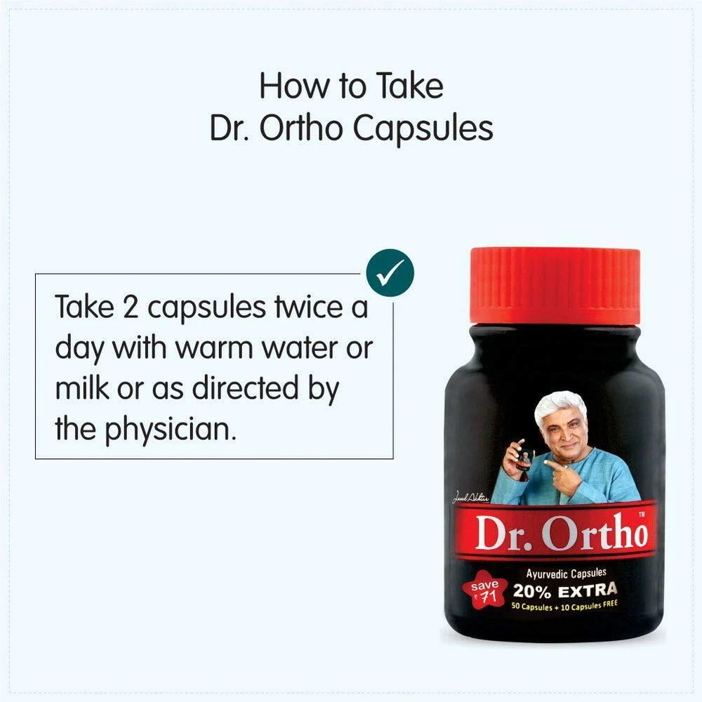 Product description Dr. Ortho Ayurvedic Capsules are made with the blend of miraculous herbs and are greatly beneficial in providing relief from joint discomforts naturally. Dr. Ortho Ayurvedic Capsules are great in relieving the painful condition of joints and muscles like stiffness, inflammation, and pain with the healing and inflammatory properties of efficient herbs.