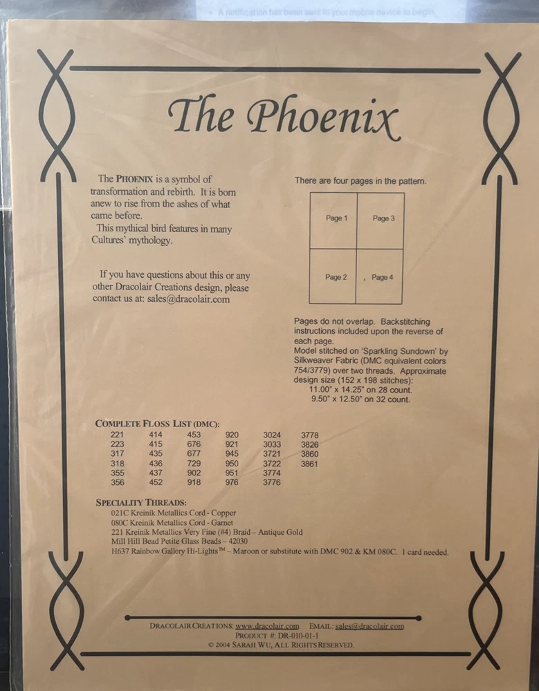 Dracolair Creations-The Phoenix Cross Stitch Pattern Product DR-010-01-1 2004 Sarah Wu Dracolair The Phoenix Cross Stitch Pattern. The Phoenix is a symbol of transformation and rebirth. It is born anew to rise from the ashes of what came before. This mythical bird features in many culture's mythology. Approximate design size (152 x 198 stitches)