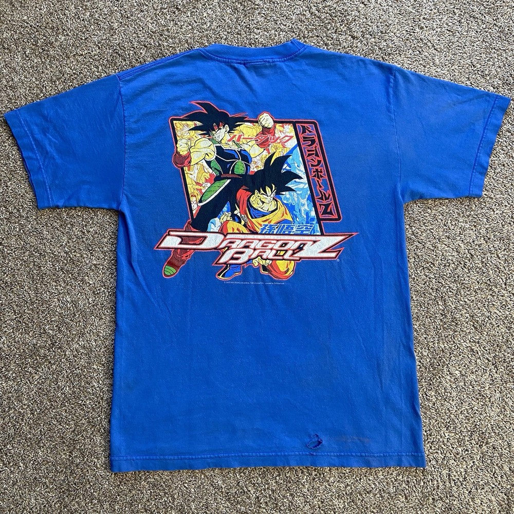 Vintage 2000’s Dragon Ball Z double sided graphic T-shirt Featuring Bardock and Goku. The tag of the shirt says it’s a Large but fits like an XL. There’s a small hole in the pit area of the shirt and a tear on the lower back of the shirt with a faint mark. Feel free to shoot an offer.