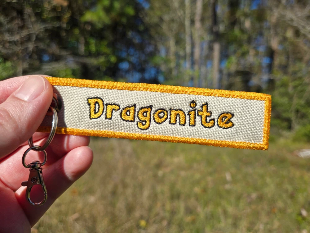 This is a Dragonite Jet Tag Keychain that I machine embroidered into waterproof canvas, it's perfect for accessorizing anything from your keyring to a lanyard or a backpack! This tag is made from waterproof canvas with a different design embroidered into the front and back. I also offer the option to have a custom name on the back of the Tag! The dimensions of this tag measure roughly 5x1in. If there is a certain character that you're interested in, please feel free to message me!