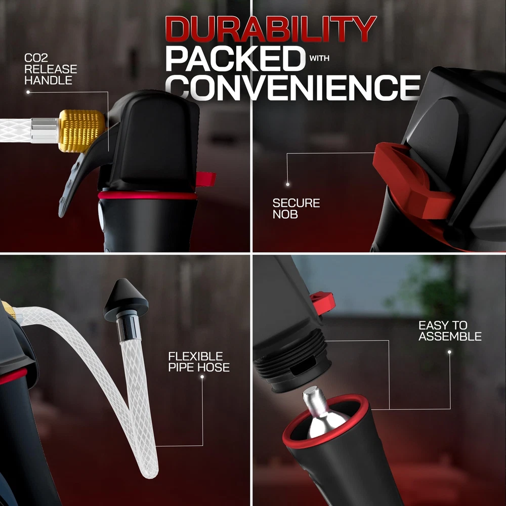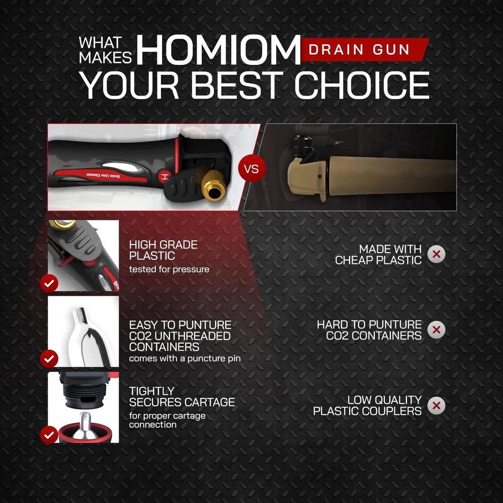 Storage and Aftercare Customer Support- Before usage check the cartridges for damage; Aftercare of HOMIOM drain gun is as much important! Clean the nozzle and drain gun to ensure no debris or residue is left behind; Got a query? Feel free to drop us a word, No question asked in Case of Refund. LIGHTWEIGHT AND PORTABLE - The Gallo Gun packs cleaning power into a small, lightweight package. This prevents the need for carrying heavy air or nitrogen tanks. AIR POWER - The Draingun uses CO2, eliminating the mess caused by water back flushing drain lines. ENVIRONMENTALLY FRIENDLY - The Gallo Gun uses carbon dioxide (CO2), a common component of air, and is totally safe for use in the environment. The Gallo gun is a wonderful alternative to the environmentally unfriendly practice of using refrigerant to clean the drain line. FLEXIBLE HOSE ASSEMBLY - The flexible hose assembly enables you to maneuver through cabinets, coils, and hard to reach drains.