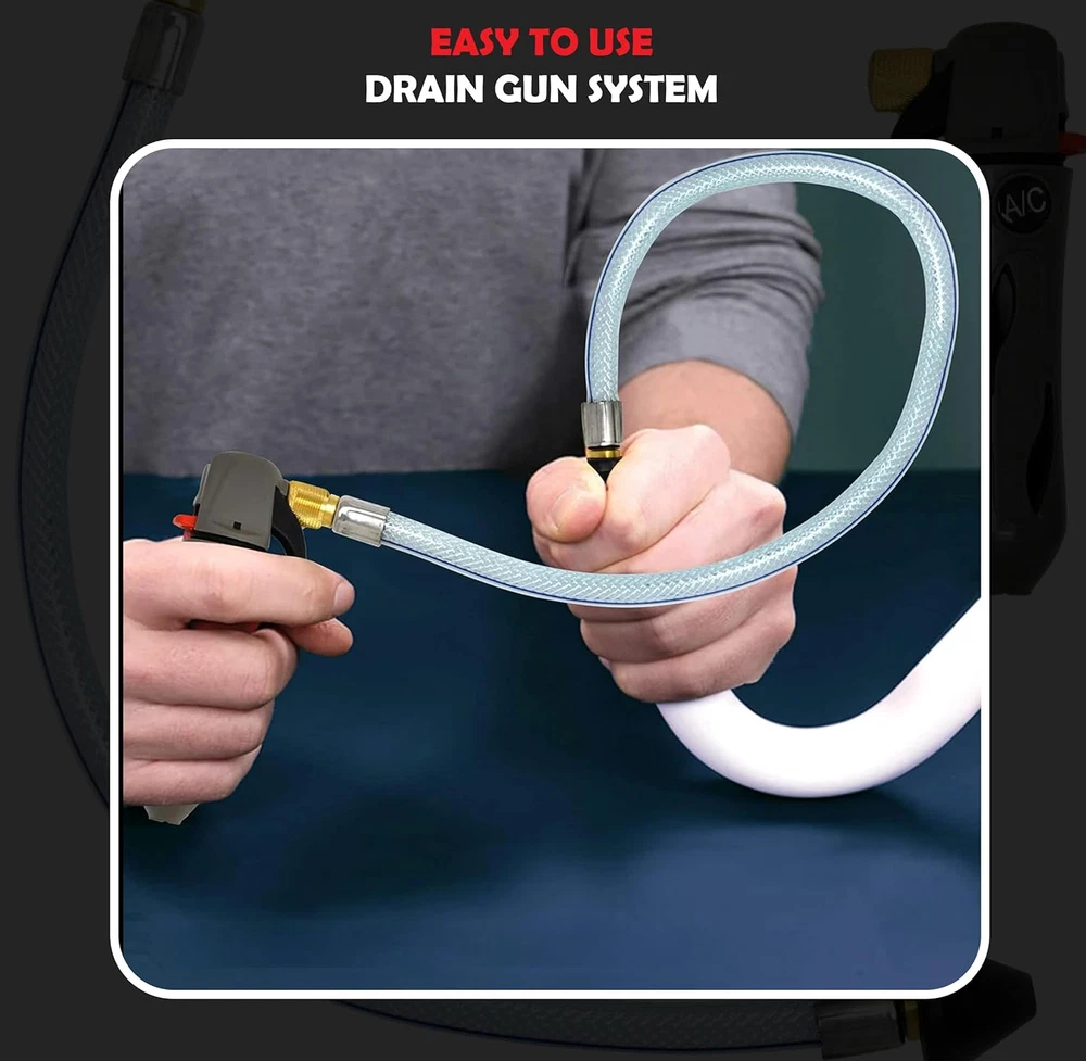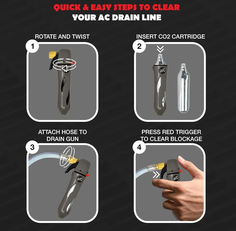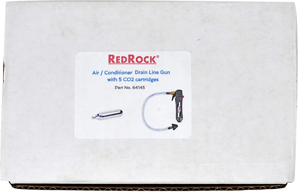 GALLO GUN - The Gallo Gun is a lightweight portable tool designed to blow out condensate drain lines instantly. Simply insert an included Gallo Gun CO2 cartridge into the Gallo Gun and with a press of the trigger - 800 psi of oil free air clears the line. LIGHTWEIGHT AND PORTABLE - The Gallo Gun packs cleaning power into a small, lightweight package. This prevents the need for carrying heavy air or nitrogen tanks. AIR POWER - The Draingun uses CO2, eliminating the mess caused by water back flushing drain lines. ENVIRONMENTALLY FRIENDLY - The Gallo Gun uses carbon dioxide (CO2), a common component of air, and is totally safe for use in the environment. The Gallo gun is a wonderful alternative to the environmentally unfriendly practice of using refrigerant to clean the drain line. FLEXIBLE HOSE ASSEMBLY - The flexible hose assembly enables you to maneuver through cabinets, coils, and hard to reach drains. Product Description Efficient HVAC Condensate Line Cleaner with CO2 Cartridge Power The RedRock Gallo Drain Gun is an efficient and convenient tool designed for clearing HVAC clogs, specifically in A/C condensate lines. This kit comes with five unthreaded CO2 cartridges, making it easy to blast through obstructions without the need for additional power sources. Its compact and portable design allows for quick and easy use, making it ideal for both professionals and homeowners. The air-powered system delivers a strong burst of CO2, effectively opening clogged condensate lines and helping maintain optimal A/C performance. With five cartridges included, the kit provides multiple uses, ensuring the system stays clear and functional. How does the CO2 cartridge system work for clearing HVAC condensate lines? The CO2 cartridges release a burst of pressurized air when triggered, which effectively blasts through clogs in the condensate lines of air conditioning units, clearing any debris or blockages. Can this CO2 blaster be used on all types of HVAC systems? Yes, the blaster is designed to work with most residential and commercial HVAC condensate lines. However, always check your system specifications to ensure compatibility. How many uses can I get from each CO2 cartridge? Each CO2 cartridge is typically single-use and provides enough pressure to clear one clog. The kit comes with five cartridges, offering multiple uses. Is the CO2 cleaning method safe for HVAC systems? Yes, the CO2 method is chemical-free, making it a safe way to maintain HVAC systems without damaging the lines. Do I need any special tools or training to use this blaster kit? No, the kit is designed for easy use by both professionals and homeowners. Simply attach the CO2 cartridge, insert the nozzle into the condensate line, and release the pressure to clear the clog.