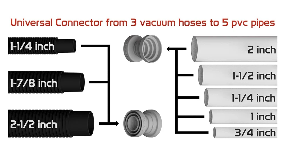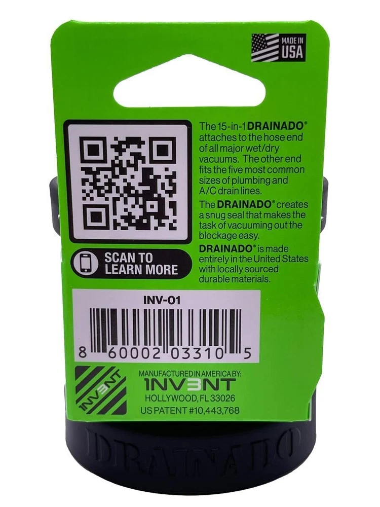 Drainado INV-01 15-in-1 Vacuum Hose to A/C PVC Condensate Drain Adapter 1NV3NT part number INV-01 Drainado 15-in-1 Vacuum Hose to PVC Adapter Helps Unclog/Drain A/C Condensate Drain Lines Adapts Drain Line to Wet Vac Quickly and Easily Drainado is a 15-in-1 adapter that connects 3 vacuum hose sizes to 5 PVC pipe sizes. This tool saves space on the work truck and saves time when dealing with various condensate line sizes on service calls. Features/Benefits Compatible with the (O.D.) of these PVC Pipe Sizes: 3/4", 1", 1-1/4", 1-1/2", 2". (Not PVC Fittings) Compatible Vacuum Hose sizes: 1-1/4", 1-7/8", 2-1/2" Compact & Durable Stay clean while performing your task Made from a high-quality material that is flexible, yet rigid Engineered for Residential & Commercial applications Designed, Made, Packaged in the USA Specifications Material: Thermoplastic Polyester Elastomer Color: Black Size: Circular 2.6" W x 2.6" H Product Details Brand DRAINADO Color Black Size Multiple Manufacturer DRAINADO Product Type Industrial Hvac Components Mpn INV-01 1NV3NT part number INV-01 Drainado 15-in-1 Vacuum Hose to A/C PVC Condensate Drain Adapter Helps Unclog A/C Condensate Drain Lines Compatible with 3/4", 1", 1-1/4", 1-1/2" and 2" O.D. PVC pipes Compatible 1-1/4", 1-7/8" and 2-1/2" Vacuum Hoses Check out my other items. - Powered by