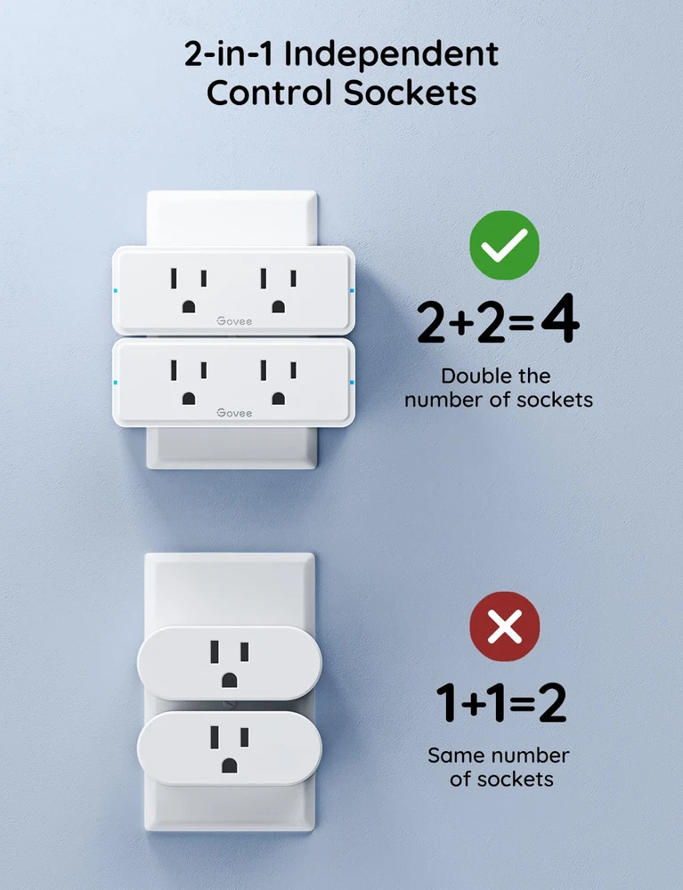 Wireless App Control: Use the Govee Home App to access the Smart Plug via WiFi and Bluetooth to enjoy powerful control and convenient features no matter where you are. Note: Don't support 5G WiFi. Smart Voice Control: Compatible with Alexa and Google Assistant for hands-free on/off control of your plugged-in devices and appliances. Note: Users must create a new Govee Home App account or be logged in to use this Wi-Fi Plug. Compact 2-in-1 Design: With 2 horizontally-positioned plugs, Dual Smart Plug only covers a single outlet in a normal vertical outlet fixture. Which expand your 2-socket fixtures into 4 smart outlets. Each sockets can be controlled independently. Set Automated Timers: Create customized timers and on/off schedules for all your devices and electronic appliances powered by Smart Plug, helping to save on energy and monthly bills. Easy to Set Up: Simply plug in Smart Plug, download the free Govee Home App to your phone, then follow the simple instructions to add the "H5082" Smart Plug. Set up only takes a minute and no other physical hub is required for wireless control. This smart plug is ETL certified, ensuring it meets stringent safety standards for reliable and secure operation. Product Description Independent or Group Control The 2 sockets of each Smart Plug can be controlled independently or together. Also create on/off schedules using Govee Home App so your morning toast and coffee are always ready when you wake. Control with Your Voice Use simple voice commands to turn on/off all your plugged-in lights, devices, and appliances using Alexa or Google Assistant via WiFi. Schedules and Timers Create customized timers and daily schedules to automatically power on/off your electronic appliances, helping save on your monthly power bill. (This function requires manual ON/OFF settings based on the day and hour of the week.) Group Control Function Using multiple Smart Plugs, program all your outlets together so all your appliances and devices switch on simultaneously right before you arrive home. Smart App Control Easily control all your home appliances powering on/off via WiFi or Bluetooth with the free, intuitive, and expansive Govee Home App. Compact Design A compact 2-in-1 horizontal design helps double available outlets without blocking others. Perfect for wireless outlet control and expansion of available sockets. Simple Setup with Govee Home App How to Connect with Govee Home App? Plug in Smart Plug Download Govee Home App. Open the app, tap the "+" icon in top right corner, and search "H5082" Tap the device icon and follow the instructions to complete pairing. Specification Rated Voltage: AC 120V Rated Current: 15A Resistive (Max) AC Frequency: 60Hz Max Total Output Power: 1800W Note: Users must create a new Govee Home App account or be logged in to use this Wi-Fi Plug.