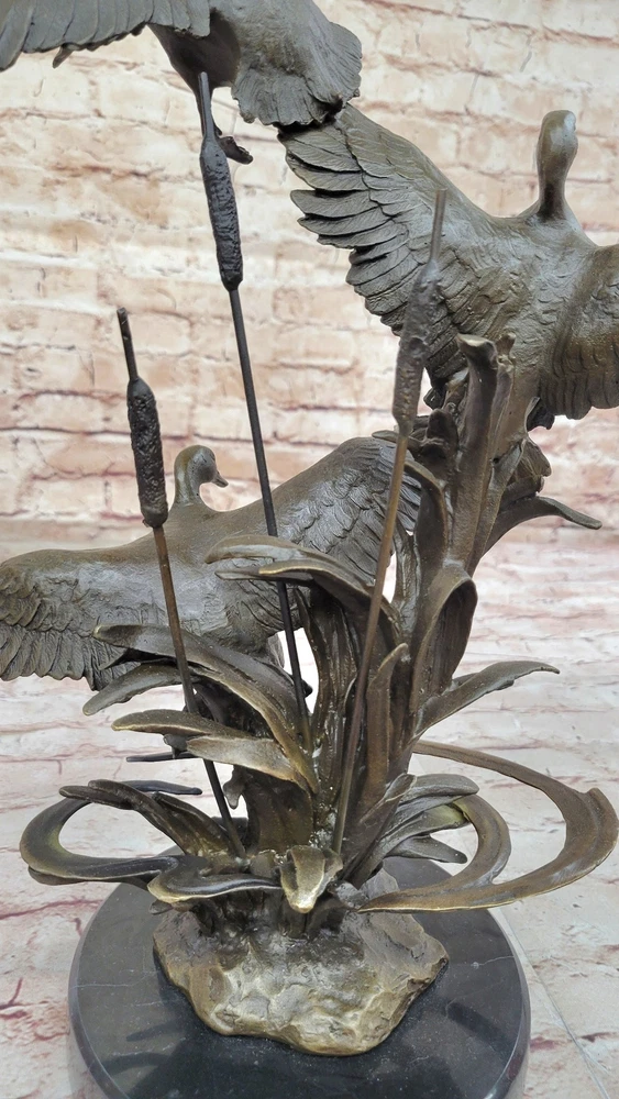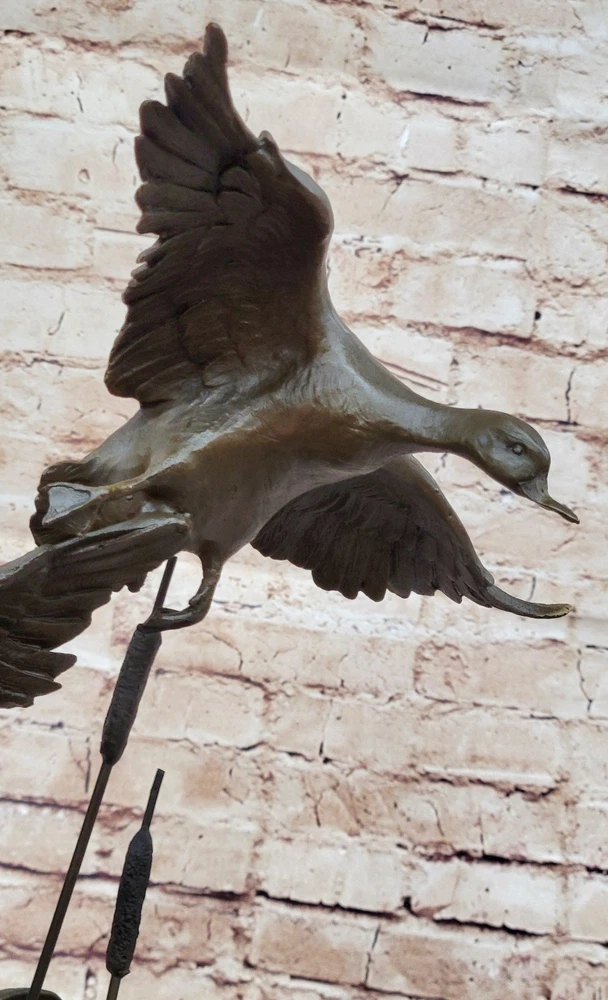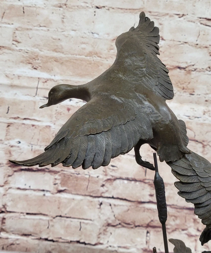 Condition : This sculpture is in perfect condition. Bronze Dimensions with Marble Base: Height 17" X Width 13" Marble Dimensions: Diameter 8" Height without base:12" Weight:15 LBS Inventory:67AL40114176 The bronze sculpture captures the essence of the majestic Ducks, celebrating their captivating mating dances and lifelong partnerships. Ducks hold symbolic significance across cultures, representing harmony, companionship, and the tranquility of nature. This exquisite artwork portrays two Ducks enjoying a peaceful day in the marsh, their feathers shining in the sunlight. One Duck grazes gracefully while the other remains vigilant, symbolizing the eternal bond and watchful care between partners. The sculpture is an ideal gift for nature enthusiasts, fishermen, hunters, or as a heartfelt gesture for couples celebrating their golden anniversary. Its lifelike details and meticulous craftsmanship showcase the beauty and symbolism of these magnificent birds. Crafted using the revered "Lost Wax Method," the sculpture is made from 100% bronze, ensuring durability and timeless elegance. The rich brown patina finish adds warmth and sophistication, accentuating the lifelike features of the Ducks. Mounted on a sleek black marble base and bearing the signature of the talented artist Williams, this sculpture is a testament to artistic excellence and a stunning addition to any space. Embrace the grace and serenity of the Ducks with this remarkable bronze masterpiece. Hot Cast Original by Williams American Artist Ducks Wildlife Bronze Sculpture Video will open in a new window Using the eBay App? Paste link into a browser window: [isdntekvideo]