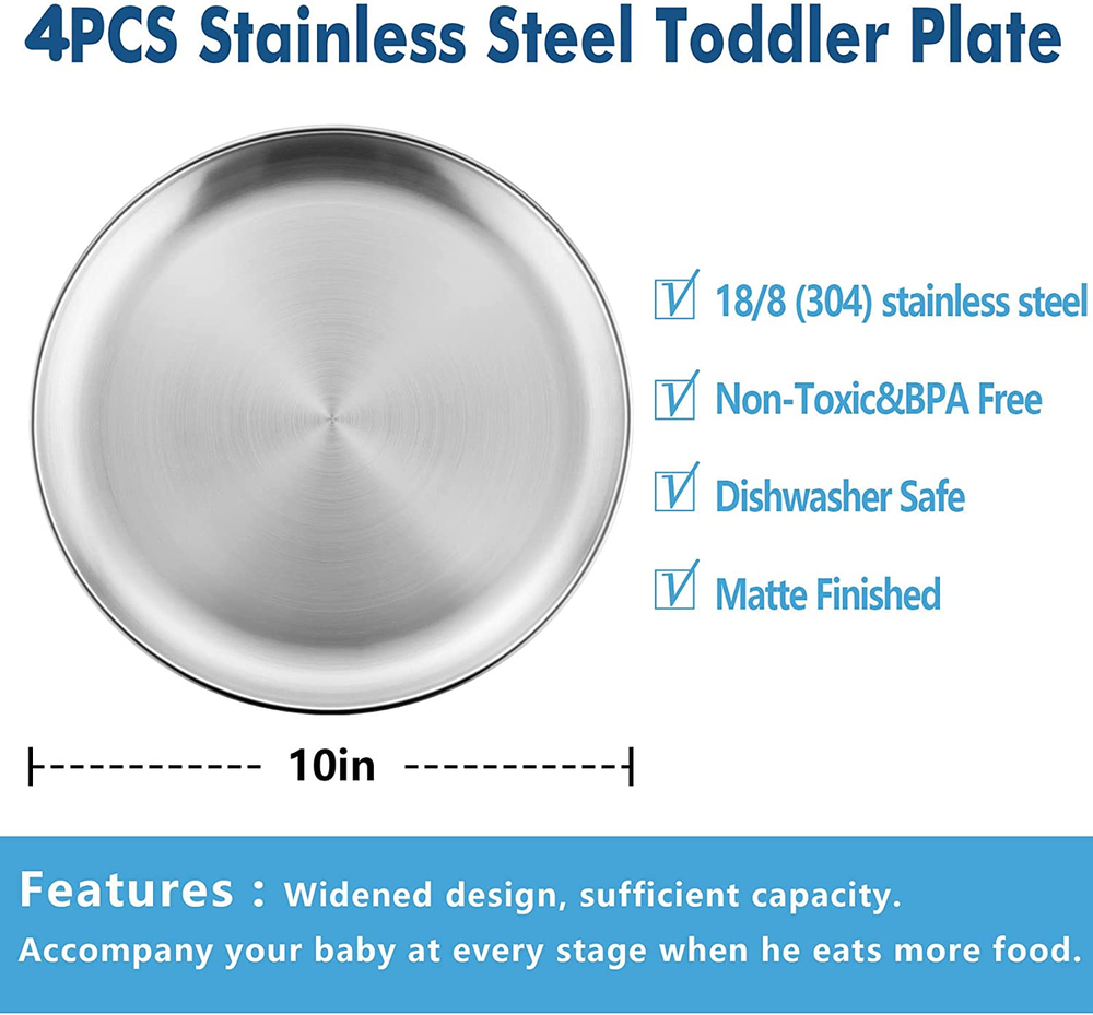 SET OF 4 - 4 x plates: 10 x 10 x 0.6 Inches (26 x 26 x 1.5cm) , Its metallic looks an advanced and doesn't feel cheap, Perfect for home daily use, Not too heavy, Suitable for feeding,camping, gathering, party, gift, etc HEALTHY MATERIAL - HaWare kids dishes is made of high quality 18/8(304) stainless steel with excellent rust resistance, No plastic, Reusable, Perfect for kids daily use, Easy to care for and dishwasher safe SAFE FOR KIDS - Smooth round edges without rough spot won't hurt your children's soft skin, No harmful substances were added to the surface of the plate, Unbreakable and don't worry about sharp shards hurting your children STURDY AND DURABLE - Sturdy enough and don't worry about it bending, Matte polished is not easy to leave fingerprints and spotting, Stackable and saves space in your cabinets PERFECT SIZE - Widened design, Can hold different kinds of food, Prepare nutritionally balanced food for your kids, Sufficient capacity, Accompany your kids at every stage when he eats more food, Also works well as a serving plate for fruit, cookies, nuts, The dishes can be heated in the oven, Great as small oven trays Product Description HaWare 10 inches 304 Stainless Steel Plates This simple plate can be used and enjoyed at any age, both for kids and adults. Good choice as a gift or serving plate for fruit, cookies, snacks Large capacity, multifunctional Suitable for home, camping, outdoor dinner etc. Safety High-quality materials make daily use safe for children. Finely rounded edges and unbreakable, don't worry about sharp shards hurting your children. Proper size for kid's hands and mouth. Wide Versatility It's a little weight in the hand but not too heavy, a very solid feeling. Works well as a serving plate for snacks and fruit. They're great for camping and outdoor meals. Plates are allowed in the oven, use them to make a small pizza or other snacks! Stackable and saves room in your cabinets. One-piece molding, very easy to clean. Dishwasher safe USING INSTRUCTION: 1.Please wash the plate with warm soapy water before first using it to wash off any processing residue left from manufacturing. 2.Please wash the plate after using and dry it before storage for your healthy daily use, and store it in a dry place. 3. Safety instruction: Because these are metal products, please don't put them in the microwave oven.
