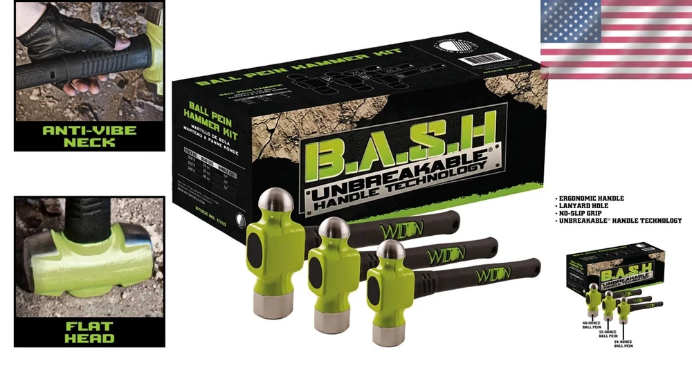 Durable Ergonomic B.A.S.H Hammer Set - 3 Hammers with Secure Grip Innovation ‹ › ‹ › ‹ › ‹ › ‹ › ‹ › ‹ › ‹ › ‹ › ‹ › ‹ › ‹ › Durable Ergonomic B.A.S.H Hammer Set Transform your tool collection with the ultimate in durability and ergonomic design! The B.A.S.H Hammer Set includes three expertly crafted ball pein hammers, perfect for heavy-duty applications and precision tasks alike. What's Included: 24-ounce Hammer (Model: 32414) 32-ounce Hammer (Model: 33214) 40-ounce Hammer (Model: 34014) Features: Patented hi-vis, drop-forged 46 HRC head constructed to endure the most demanding applications. Unbreakable Handle Technology employs a steel core that eliminates breaking during overstrikes. Safety plate secures the head to the handle, preventing dislodging during use. Ergonomic 14" handle is expertly shaped and thickened for improved comfort and reduced vibration. Vulcanized rubber handle delivers a secure, no-slip grip while striking, ensuring maximum efficiency. Lanyard hole allows for safe securing to a wrist or stationary object, enhancing user safety. Why Choose the B.A.S.H Hammer Set? At , our pursuit for excellence has led us to design the world's most indestructible hammers, combining revolutionary design with unparalleled functionality. The B.A.S.H Hammer Set is perfect for professionals and DIY enthusiasts alike, offering performance, safety, and comfort. Experience the extraordinary resilience and comfort with a hammer set that caters to all your needs—be it for intricate work or more demanding tasks. Elevate your toolkit with the B.A.S.H Hammer Set today! Shipping Free & Fast Shipping - We offer free shipping to most of the USA with a normal delivery time of 3-7 days. However, due to the current situation, additional delivery time (up to 3 weeks) may be required for some items. Alternative Carriers - We may use alternative carriers (e.g. USPS, FedEx, UPS, etc.) to ensure your package arrives safely and on time. Due to the use of multiple carriers, we are unable to provide a tracking number automatically. Handling Time - Orders are processed and shipped within 1-2 business days of receiving cleared payment. Shipping Restrictions - Shipping to Alaska, Hawaii, Puerto Rico, Guam, and other US territories may incur shipping charges or delivery restrictions. Please contact us before ordering, or your order can be refunded/cancelled. State Restrictions - There may be restrictions based on your state of purchase. For example, certain items may not be shipped to California due to state regulations. Contact for Tracking Updates - If you require tracking updates or have any concerns about the delivery of your order, please feel free to contact us, and we will be happy to assist you. Return Please see our eBay Return Policy. Thank you. Payment We accept all major credit cards, PayPal, and Apple Pay for your convenience. Your payment information is secure and encrypted to ensure a safe and seamless transaction. Please complete your payment within 3 days of purchase to avoid any delays in shipping. Feedback Your feedback is extremely important to us. We strive to provide the best products and customer service possible. If you are satisfied with your purchase, please take a moment to leave us a positive review. If you have any concerns or issues with your order, please contact us before leaving negative feedback. We are committed to resolving any problems and ensuring your satisfaction. Contact Us If you have any questions or concerns, please feel free to reach out to our customer support team. You can contact us through the eBay messaging system. We are available Monday to Friday, 9:00 am to 5:00 pm EST, and we will do our best to respond to your inquiry within 24 hours. Thank you for supporting our small family business! UPC: Not Set Model: Ball Pein Hammer Kit Item Weight: 8 lb Item Width: Ball Pein Hammer Kit Item Length: Ball Pein Hammer Kit Item Height: Not Set Item Diameter: 14 in Unit Quantity: 3 Handle Material: Rubber Brand: Unbranded Type: Ball Peen Hammer Head/Face Material: Steel Number of Pieces: 3 Color: Green Handle Size: 14 in Manufacturer Warranty: Not Set MPN: Not Set Country/Region of Manufacture: Not Set Unit Type: lb Personalize: Not Set