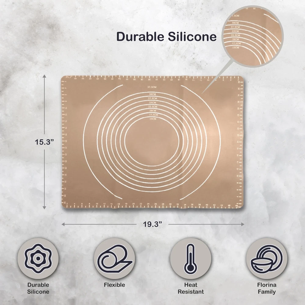 Silicone baking mat for rolling out pastry dough, pie crusts, homemade pasta, and and cookies. Convenient measuring guides help you size your pie crusts like a professional baker. Our silicone is heatproof up to 600 ºF, so you can enjoy the convenience of dishwasher washing.Size: 19.48” x 15.43”. Thickness: 0.011”. Weight: 0.009 lbs. Free Shipping Over $49.99* Details Durable Silicone 10" Baking Mat with Measuring Dimensions Product Description: Silicone baking mat for rolling out pastry dough, pie crusts, homemade pasta, and and cookies. Convenient measuring guides help you size your pie crusts like a professional baker. Our silicone is heatproof up to 600 ºF, so you can enjoy the convenience of dishwasher washing. Size19.48” x 15.43”. Thickness0.011”. Weight0.009 lbs.
