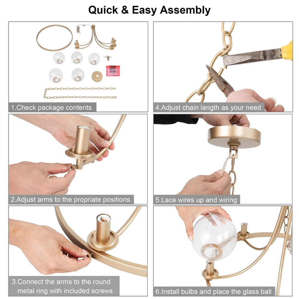 The modern gold chandelier comes with 5 seeded glass globe shades, which effectively protected the bulbs while emitting maximum light sources through the clear shades. The metal frame in a dark-gold finish is durable, solid, and very stable in thickness and shape. The pendant lighting fixture arrives part assembled with all the arms pre-wired for quick and easy assembly. All hardware and installation manual are included. 【Modern Globe Chandelier】- If you are looking for a stunning and modern chandelier that adds your dining or living rooms with a layer of chicness and personality, this glass ball pendant light will fit the bill. The large round metal frame is finished in dark gold, silently holding the 5 light sources, with seedy glass shades covered. The sleek and classic shape makes the chandelier an ideal option for any contemporary dining room, living room, bedroom, foyer, or hotel lobby. 【Ideal Dimensions】- Chandelier Size: 24"D x 21"H, highly recommend for a dining/living room, bedroom, or foyer. Canopy Size: 4.7"D x 1"H, designed to fully cover the junction box of standard size. 【Height Adjustable】- The gold pendant chandelier is equipped with a 59" chain, allowing you to adjust the overall height of the light from Min 24.5" to Max 82". Perfectly fits flat, sloped, slanted, vaulted, or high ceilings. 【Bulb Requirement】- 5 x e12/max 40w bulbs are required for this modern chandelier. Incandescent, led, CFL, vintage filament bulbs are compatible. Please note the diameter of the bulbs should be less than the opening of the glass ball (2.5"). 【Fully Dimmable】- The chandelier is compatible with a dimmer switch and dimmable bulbs, so that can satisfy your different brightness demands. 【Easy to Install】- The matte gold chandelier arrives part assembled, with all the arms pre-wired for quick and easy installation. The arms are rotatable, please adjust them to the appropriate positions. All hardware and user manual are included. Hardwired, professional installation recommended. 【Safe in Use】- The bulb sockets and electric wires of the globe chandelier are ETL listed for your safety. Please note the chandelier only works in dry locations. 【Buy with Confidence】- All of our products have passed strict inspection before shipping. And to ensure your 100% satisfaction, we put a 2-year limited warranty on our lighting products against any defects in quality and craftsmanship. Please feel free to contact us both pre-sales and after-sales if you have any questions.