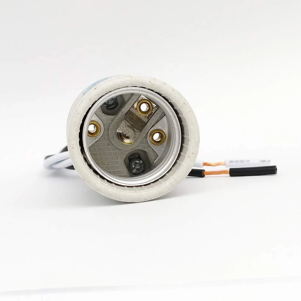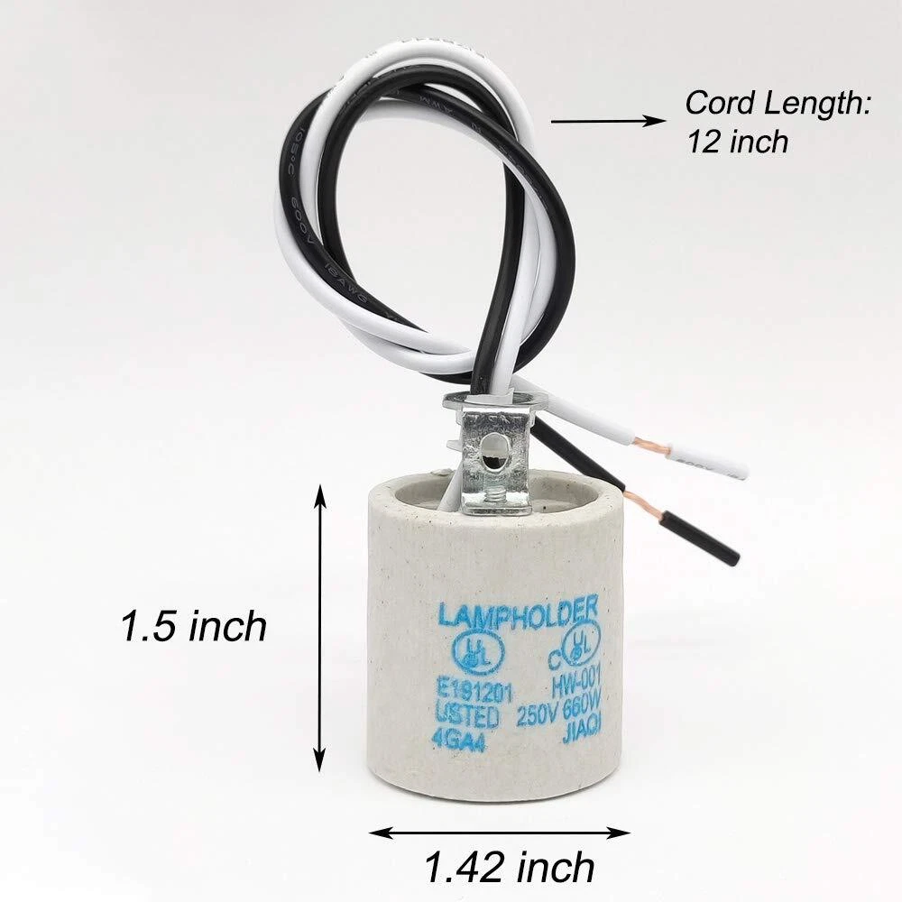 Specification: Max Voltage/Wattage: AC250V / 660W Material:Ceramic base, copper connector and iron bracket. E26 porcelain light socket with wire length: 300mm/ 12 inch Diameter of female thread: 5.7mm/ 9/40" Socket Dimension(ceramic part): Dia35mm X H38mm/ Dia7/5" X H3/2" Package Included: 5 Pack x Ceramic Candelabra E26 Socket UL Listed. 5 Pack E26 medium base light sockets suitable for all E26 E27 incandescent, halogen, CFL and LED light bulbs. Made of highly-resistant insulating ceramic, can handle high heat light bulb. Durable fireproof materials, No Fire Hazard & Erosion-resistant. High temperature resistant, isulated wire could stand termperature 200 degree. Use safety. Fitted with female threaded iron brackets.The porcelain socket could be fixed by a male threaded tube. Any issue about our E26 light socket, please feel free to contact us for help, we will reply you within 24 hours.