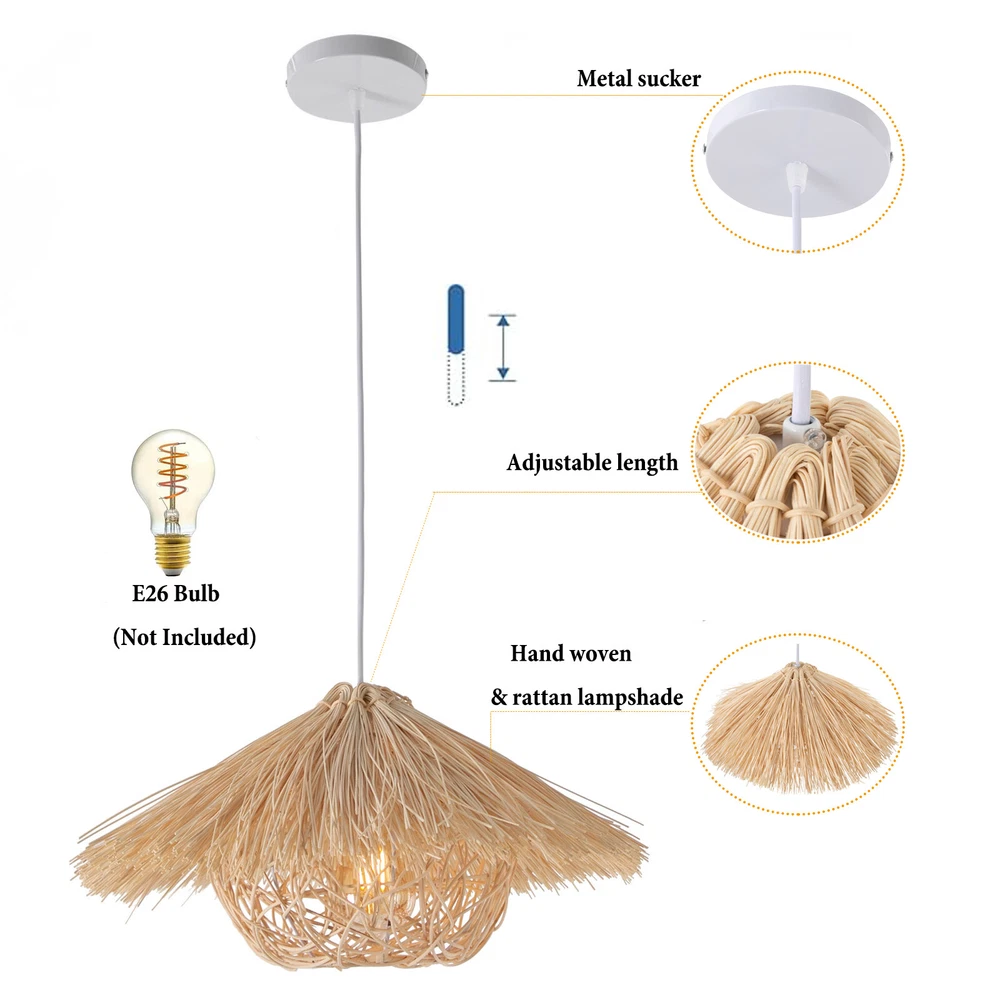 Application With a lighting area of 215.28-322.92 ft², it is suitable for flat and sloping ceilings in kitchens, living rooms, bedrooms, balconies, bars, aisles, foyers, hotels, restaurants, corridors, cafes, children's rooms, libraries, basements, clubs, and other indoor places. Specification Material: Rattan, Iron Process: Hand-Woven Color: Wood Color Style: Bohemian Assembly Required: Yes Indoor/Outdoor Usage: Indoor Mounting Type: Ceiling Mount Efficiency: E Light Source: 1* E26 Bulb(Not Included) Max. Bulb Power: 60W Voltage: 110V Lighting Area: 20-30m²/ 215.28-322.92 ft² Base Diameter: 12cm/ 4.72in Package Included 1* Chandelier All Accessories for Installation E26 Wicker Rattan Shade Pendant Light Hand-Woven Farmhouse Ceiling Lamp Fixture Description This chandelier will not only bring light and warmth to your life but also add interest to your room. The hand-woven look complements the theme of the room and adds a beautiful visual effect to the room wherever it is placed. In addition, you can also adjust its height according to your actual needs and preferences. It is not only a light but also a beautiful decorative piece. Key Features Sturdy and Durable: This product is made of high-quality rattan and iron with a hand-woven process, which is environmentally friendly, non-toxic , stable, and durable. Unique Appearance: The hand-woven lampshade is simple in design and novel in appearance, and the light is projected on the ceiling through the lampshade to form a very beautiful pattern, making your room more romantic. Adjustable Height: You can adjust the height of the chandelier by adjusting the length of the hanging wire ( 3.94-39.37in ) for different ceiling heights. Thoughtful Design: The semi-open shade not only allows light to diffuse and illuminate the space but also makes it easy to change the bulb. Meet Your Needs: Our product is available for dimmable bulbs(not included), and you can adjust the color of the light source to suit your needs. Easy to Install: With a simple structure and complete set of accessories, all you need to do is finish assembling the chandelier, then connect the pre-wired wires on the ceiling and screw the E26 bulb( not included ) into the lamp holder. Ideal Gift: This product is stylish and high-quality and can be used as an ideal housewarming, birthday, and holiday gift for parents, friends, and loved ones. Good Customer Service: We stand behind all our guests and look forward to assisting you with your purchase. It is our pleasure to answer your confusion and questions. The end of the story between us is not "we sell and you buy". Details E26 Lamp Head: The standard E26 lamp head is suitable for incandescent, halogen, LED bulbs, etc. for easy replacement. Solid Base: The large round base ( diameter: 4.72 in ) increases stress area, and can make the item fixed firm without falling easily. Application With a lighting area of 215.28-322.92 ft², it is suitable for flat and sloping ceilings in kitchens, living rooms, bedrooms, balconies, bars, aisles, foyers, hotels, restaurants, corridors, cafes, children's rooms, libraries, basements, clubs, and other indoor places. Specification Material: Rattan, Iron Process: Hand-Woven Color: Wood Color Style: Bohemian Assembly Required: Yes Indoor/Outdoor Usage: Indoor Mounting Type: Ceiling Mount Efficiency: E Light Source: 1* E26 Bulb(Not Included) Max. Bulb Power: 60W Voltage: 110V Lighting Area: 20-30m²/ 215.28-322.92 ft² Base Diameter: 12cm/ 4.72in Hanging Wire Length: 100cm/ 39.3in Adjustable Height Range: 10-100cm/ 3.94-39.37in Lampshade Diameter: 42cm/ 16.53in Lampshade Opening Diameter: 12cm/ 4.72in Lampshade Height: 20cm/ 7.87in Package Included 1* Chandelier All Accessories for Installation Notes Please check the dimensions of the product before ordering to ensure it fits your home. Please make sure the power is cut off before installation. To ensure your safety, we recommend that two people install it together. Please install it by someone with an electrical license if necessary. Please wear electric insulation gloves (not included) and avoid scratching the surface of the item and the electric wire when installing. Please use it within the applicable voltage range and clean it regularly. Please cut off the power supply when you clean the item. Please wipe with a soft cotton cloth and do not use household cleaning agents. Please use it in a dry environment. It is not suitable for outdoors and bathrooms. Please allow the slight color difference caused by the shooting light and the 1-3 cm error due to manual measurement, and make sure you do not mind before ordering. Payment Delivery details Terms of sales About us Contact us Payment We accept ebay payment 。 Fees such as import duties, taxes are not included in the item price or shipping costs. These charges are the buyer's responsibility. Delivery details Shipping: 2-9 working days to: USA Terms of sales We maintain high standards of excellence and strive for hundred percent customer satisfaction. Feedback is very important to us. We hope that you contact us immediately before you give neutral or negative feedback, so that we can address your concerns. It is impossible to address issues if we do not know about them! About us Your satis faction is our ultimate goal. We work hard to earn your trust and future business. Our certified technicians have tested each item before shipping. The unit comes with 1 year limited warranty on all manufacturing defects. a) If you receive a defective item, you may return it or ask for a discount. Please contact us within 14 days after you receive the package. b) What you returned must be intact and in its original packaging as re? u. Customer is responsible for shipping costs of the returned item. c) We will cover the cost of shipping back t with the shipping rate indicated in the registration page. We will send you a new unit or refund the full payment you paid. Thank you. Contact us Business Hour Business Hour: M