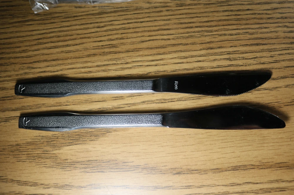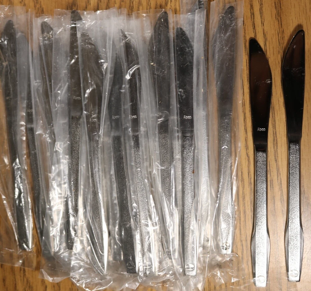 EASTERN AIRLINES 22 Knife Lot Abco First Class Dinner Service Silverware Knives 22 knives with Eastern Airlines logo. Most are wrapped and look unused, but expect some scuffs and scratches, minor dirt from poor storage. Condition: Used. Very Good. Some scuffs and scratches, minor dirt.