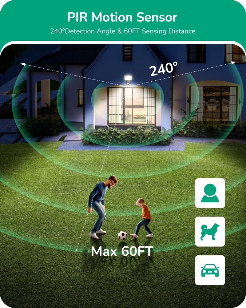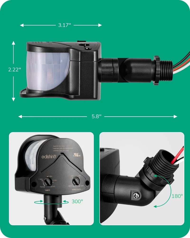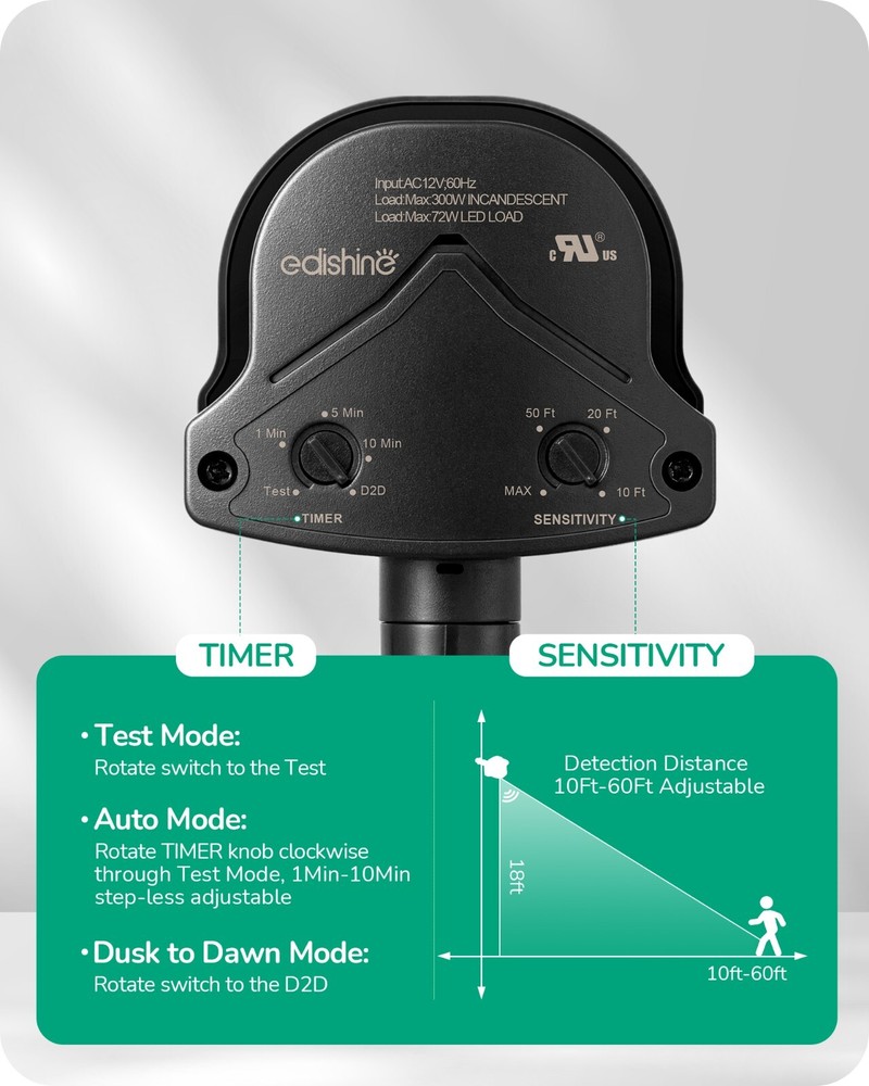 EDISHINE Dusk to Dawn Motion Sensor with 240° Detection Range & 60FT Detection Distance, 120V AC, Outdoor Motion Sensor, Replacement Motion Sensor for Garage, Yard, Driveway, Porch, Black, 2 Pack About this item [3 Modes] This motion detector has 3 modes: ①AUTO Mode: when motion is detected in the dark, the light turns on and turns off after 1 to 10 minutes; ②D2D Mode: Automatically turns on at night and off during the day; ③Manual Override Mode: Allows manual control to turn the light on and off, the light stays on for 8 hours and automatically turns off at dawn [Adjustable Time & Detection Zone] The pre-selection delay time of the outdoor motion sensor can be adjusted from 10 seconds to 10 minutes on the "TIMER" knob; the sensing coverage can reach up to 60ft with a detection range of 240°, just customize according to your specific requirements [Adjustable Sensor Head & Wide Application] Designed with longer pivot arm, our dusk to dawn motion sensor can be adjusted vertically up to 180° and horizontally up to 300°, easier to aim the sensor at the desired location; suitable for most outdoor/indoor wall and eave installations, such as garage, driveway, porch, backyard, front door [Replace Existing Motion Sensor] The replacement motion sensor outdoor is an excellent alternative, allows you to repair or update existing fixtures without replacing the entire luminaire, saving you money; easy to install and set up, including wire nuts for easy wiring; Rated load: maximum 300W incandescent, maximum 72W LED driver/LED bulb [Input & Warranty] Wide range of input: 120V AC 60HZ; 1-Year Warranty provided, EDISHINE professional customer service team offers 24/7 delicate support, we are always standing by you