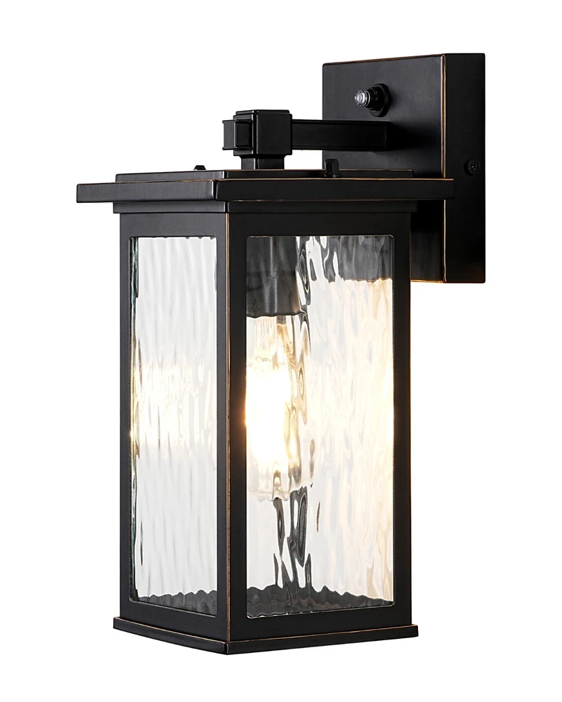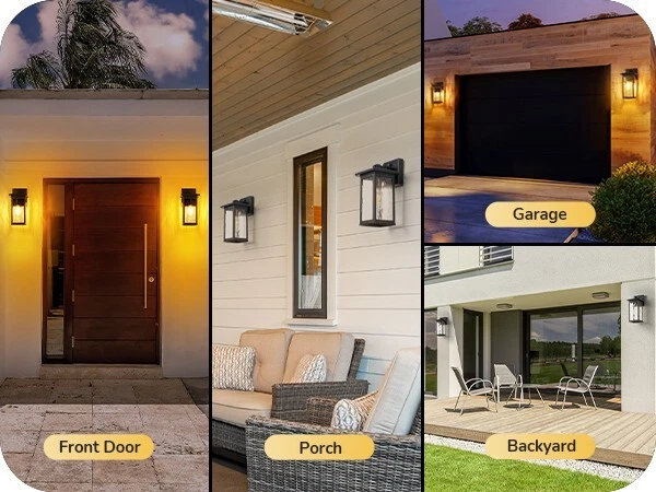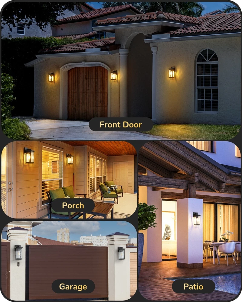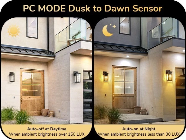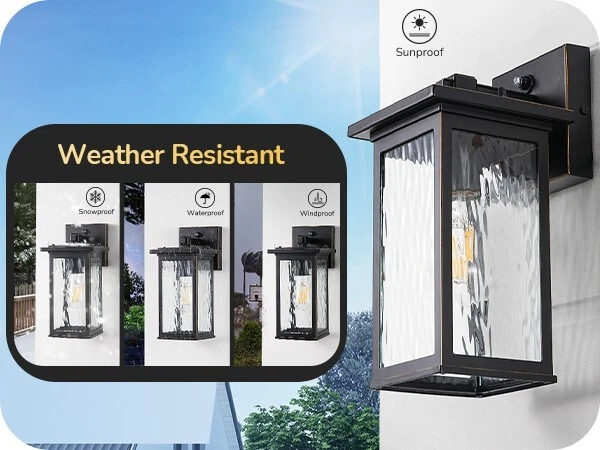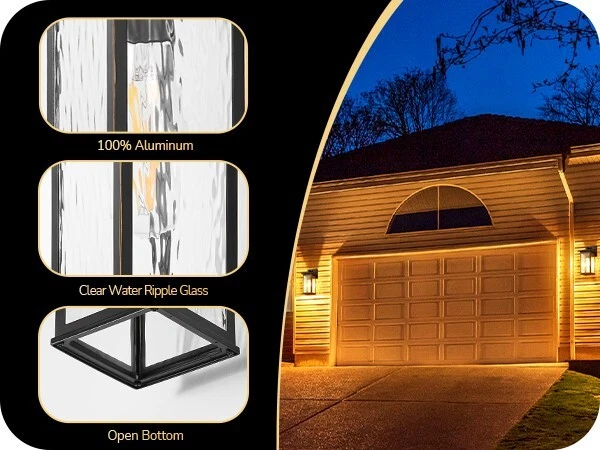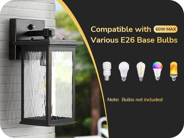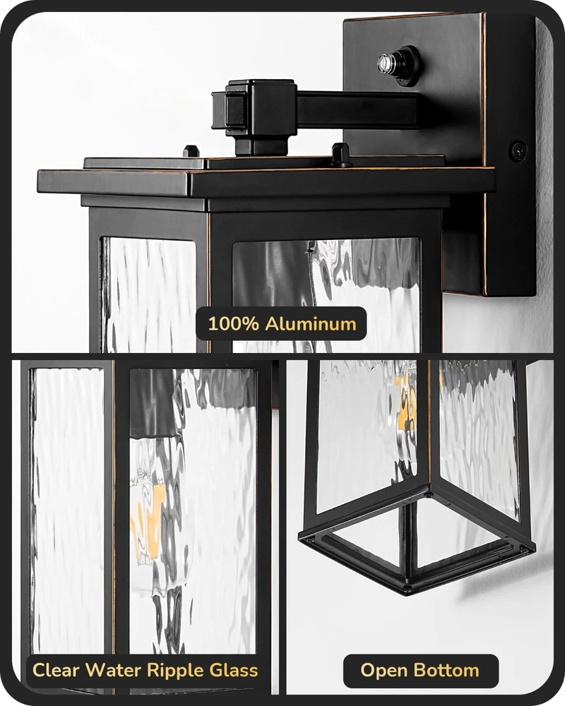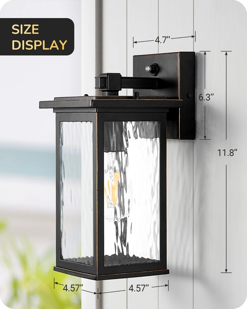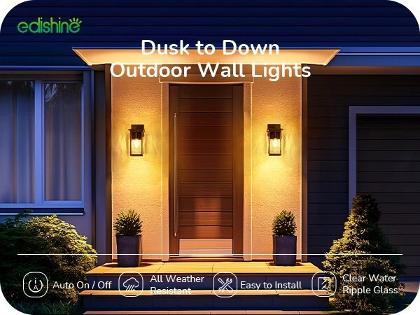 EDISHINE Outdoor Wall Light, Dusk to Dawn Exterior Light Fixture, Modern Porch Light Wall Mount Sconce, Clear Water Ripple Glass, Black Metal Outside Wall Lantern for Front Door Garage Patio About this item [PC Mode] Our outdoor wall lantern features dusk-to-dawn sensor technology, as the sun sets, it automatically illuminates with a soft glow to welcome the night, when the first rays of morning light appear, it intelligently turns off, enhancing your home's energy efficiency [Ripple Glass Shade] This outdoor light fixture has a clear ripple glass shade that mimics the flow of water, each beam of light passing through seems alive, dancing gracefully in your space; black painted finish with gold detailing adds a refined touch, ideal for front door, porch, garage, patio, hallway, balcony [Durable & Weatherproof] Crafted with premium aluminum with a high-tech painting process, the exterior wall lamp is rust-resistant and corrosion-proof, effectively withstands harsh weather conditions, ensuring the light remains secure and reliable, day and night, through all seasons [Convenient Open-Bottom] The specially designed large opening at the bottom of the lampshade simplifies bulb replacement; no need to disassemble or use complex tools; one person can easily complete the outside wall sconce process; you will appreciate the unprecedented convenience [Standard E26 Base] This dusk to dawn front porch light perfectly accommodates various E26 base bulbs (up to 60W), including LED, incandescent, halogen, and CFL bulbs (bulbs not included); allows you to choose the ideal bulb for your needs, creating the perfect lighting effect