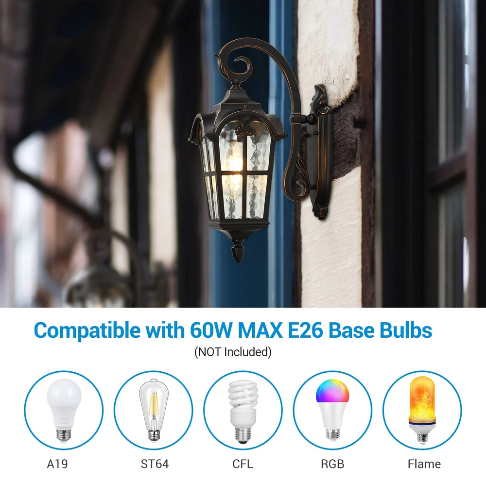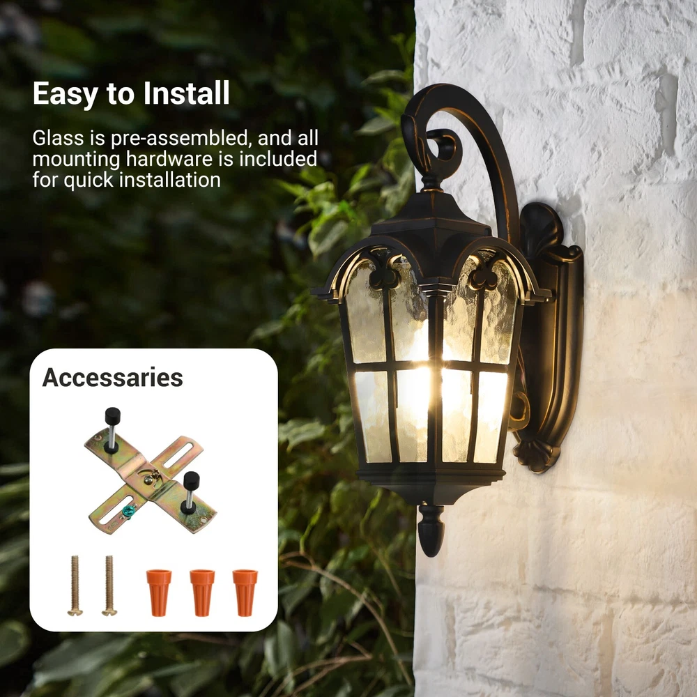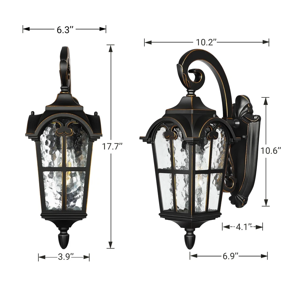 DEWENWILS Outdoor Wall Light Fixtures Wall Mount, Black Roman 17.7" H Exterior Wall Lantern, Anti-Rust & Waterproof, Water Ripple Glass, Outside Wall Sconce Porch Light for House, Garage Retro Design Matte Black finish with golden edge, adds a retro and gorgeous look on your house, as well as brightening your way at night. Easy Installation Hardwired design, all necessary hardware is included for direct installation. Sealed bottom design for preventing water and insects from pilling up. Weaterproof & Anti-rust Thick die-casting aluminum frame ensures stability. Weather resistant, will never get rusty or corrosive after years of use. About this item [Vintage & Water Ripple Glass] Matte black finish with glitzy gold edges endows the 17.7" exterior light fixture a elegant and vintage look; the hammered moire glass shade is easy to clean and stylish, and the light reflects wonderful patterns on the wall, gorgeous lighting effects [Durable Aluminum & Weatherproof] The outdoor light fixture is made of die-cast aluminum and high-tech coating, anti-rust, and anti-corrosion, and can be used for many years; IP65 weather-resistant, no matter in rainy, snowy, windy, or sunny days; sealed design keeps out moisture or bugs [E26 Socket] Compatible with various E26 bulbs up to 60 watts(sold separately), including LED, CFL, incandescent, or halogen bulbs; with water ripple glass shade, the outdoor wall light creates a truly unique look by adding a vintage Edison bulb; 1-year warranty provided [Hassle-free Installation] The glass is pre-assembled, hardwired design, all mounting accessories are included for easy and quick installation; sealed bottom for keeping insects from pilling up; for better performance, please install this outdoor wall lantern at least 6ft from the ground [Wide Application] Comes with all necessary accessories for easy installation; you can mount the porch light fixture in your patio, garden, balcony, front door, and doorway, not only brightening your hallways, but also adding vitality to your house Dimensions - Total Height: 17.7'' - Front to Back- 10.2'' - Backplate: 10.6'' x 4.1‘’ (H x W)