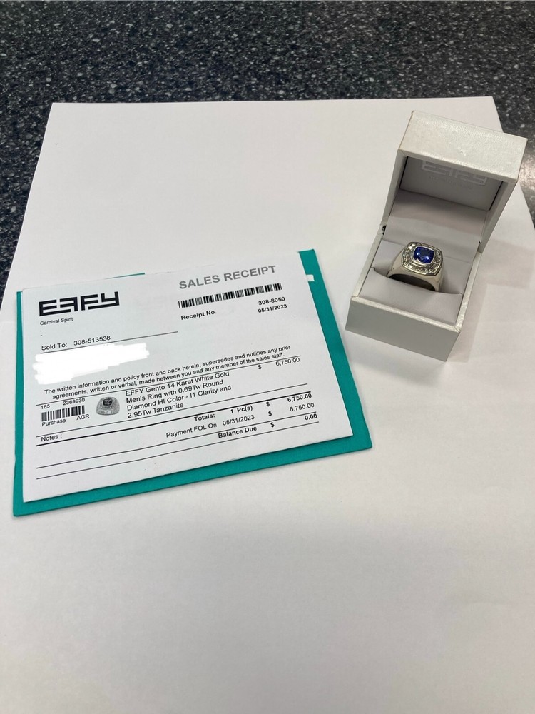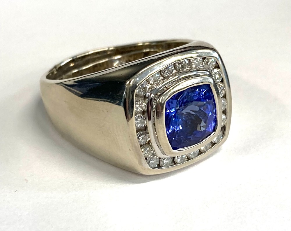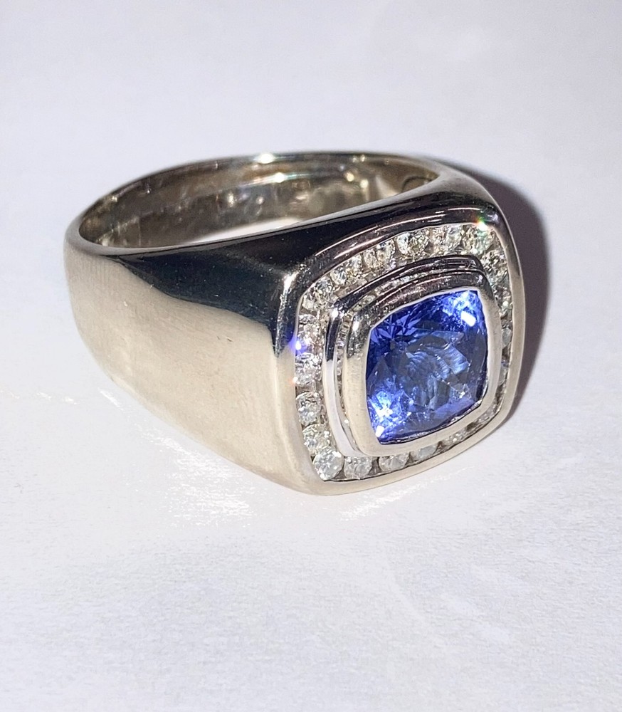 This ring by Effy features a square-shaped tanzanite as the main stone, accented with 20 round blue diamonds. The setting is made of 14k white gold with a 2 mm wide band, and the total carat weight is 2.95. The ring is designed for men in size 11 and is a stylish piece of fine jewelry. 14K WHITE GOLD TANZANITE & DIAMOND RING 2.95CT TANZANITE 69PTS OF DIAMONDS 9.6 DWT WITH ORIGINAL PAPER WORK