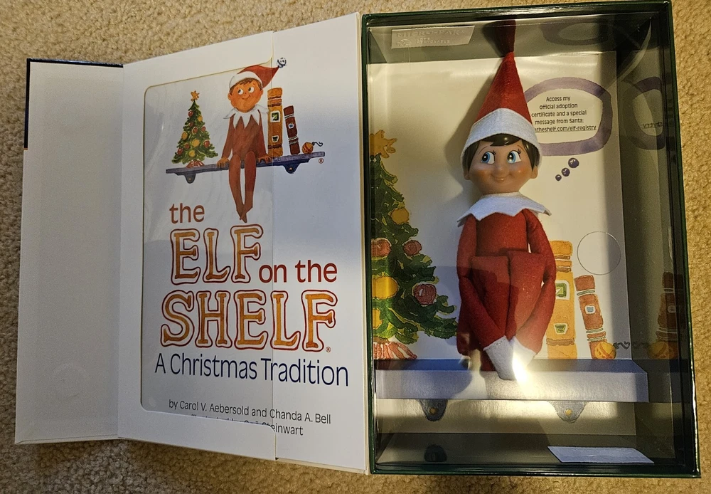 This beloved family tradition has captured the hearts of children everywhere who embrace the magic of having a Scout Elf® mascot who reports to Santa each night during the holidays. This boxed set has everything needed to make lasting Christmas memories! Includes: Adoptable elf in red hat with white trim and solid red suit with white collar. The Elf on the Shelf® Tradition: A Christmas Tradition storybook in English. Keepsake box. Official adoption certificate. Access adoption certificate on website. The items are new with some scuffs on boxes from shipping and handling.