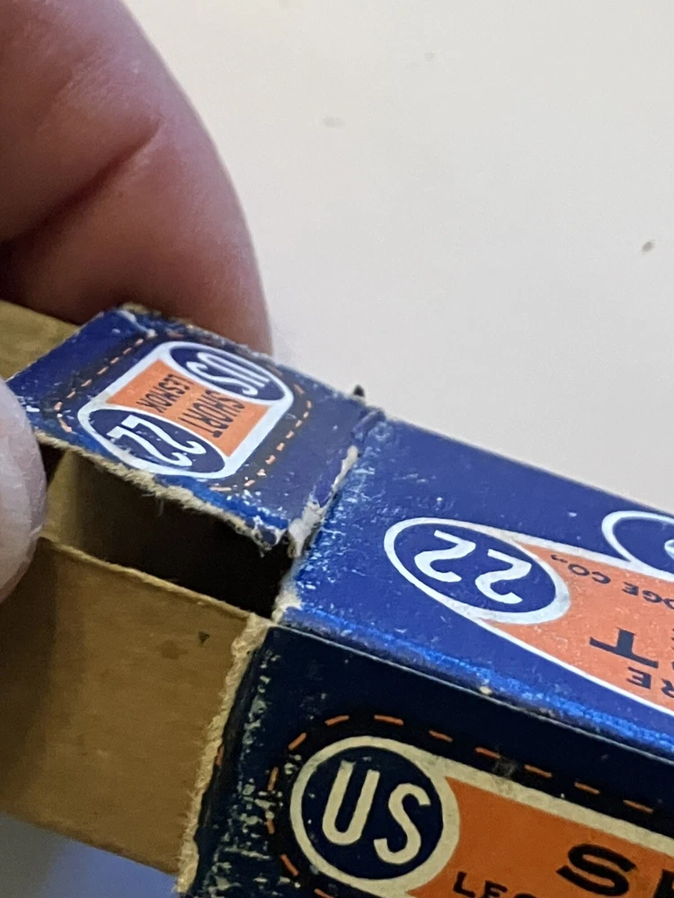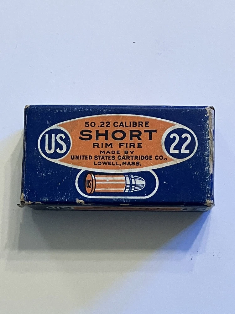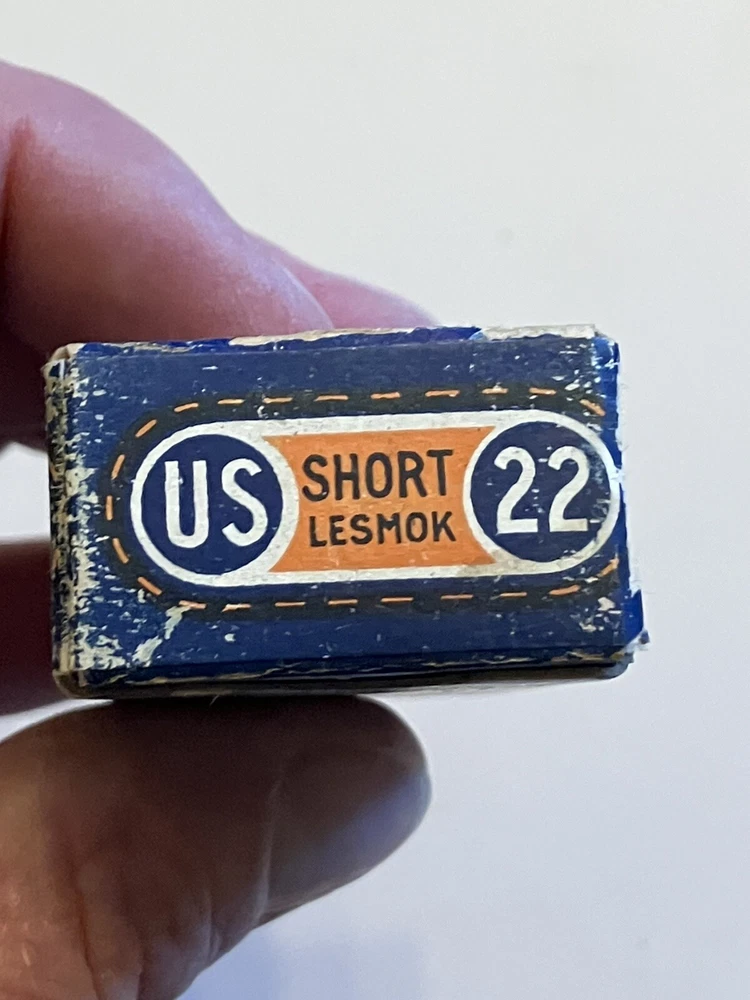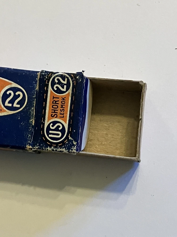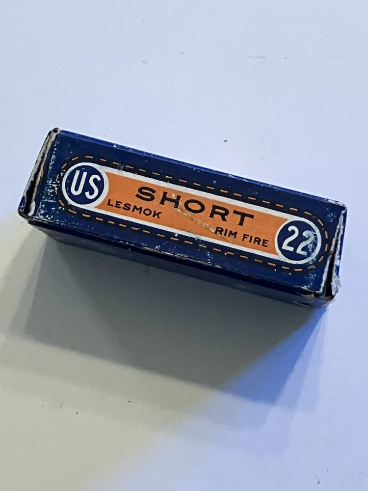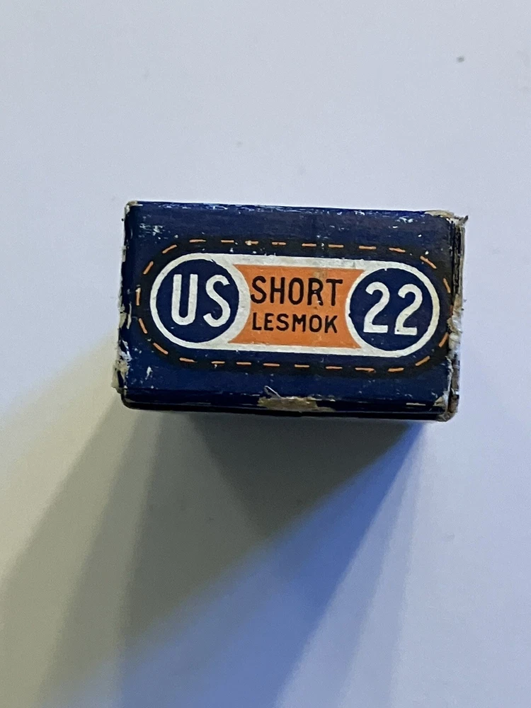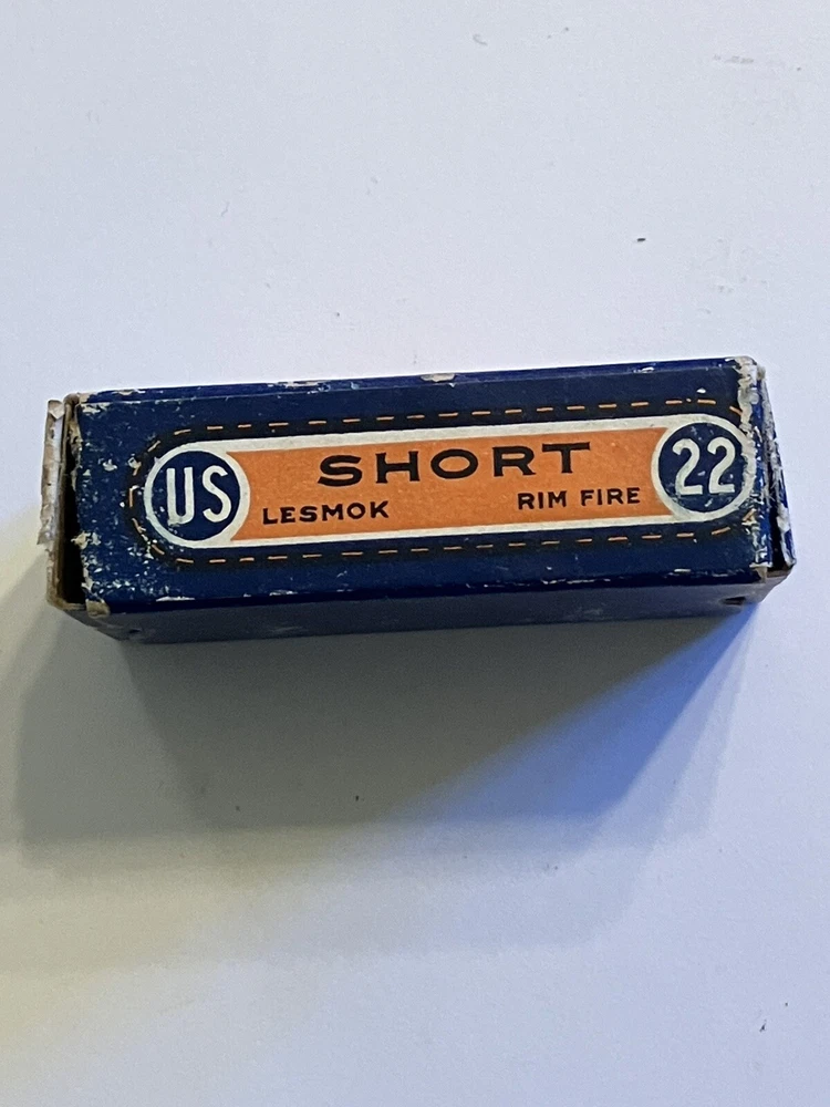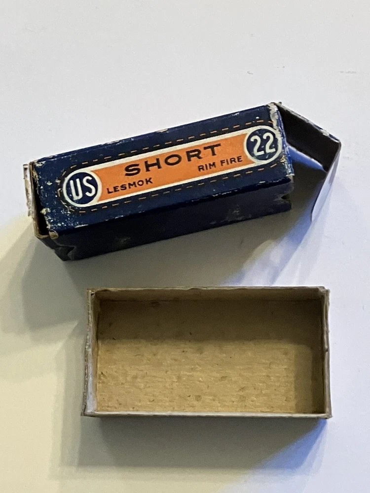 Empty ammo box for your collection; United States Cartridge Co. .22 caliber SHORT - RIM FIRE box. " NRA LONG RIFLE LESMOK " Vintage box is in used condition. One end flap has partial tear, see pic. More EMPTY ammo boxes listed - combine 'wins' to save on shipping$!