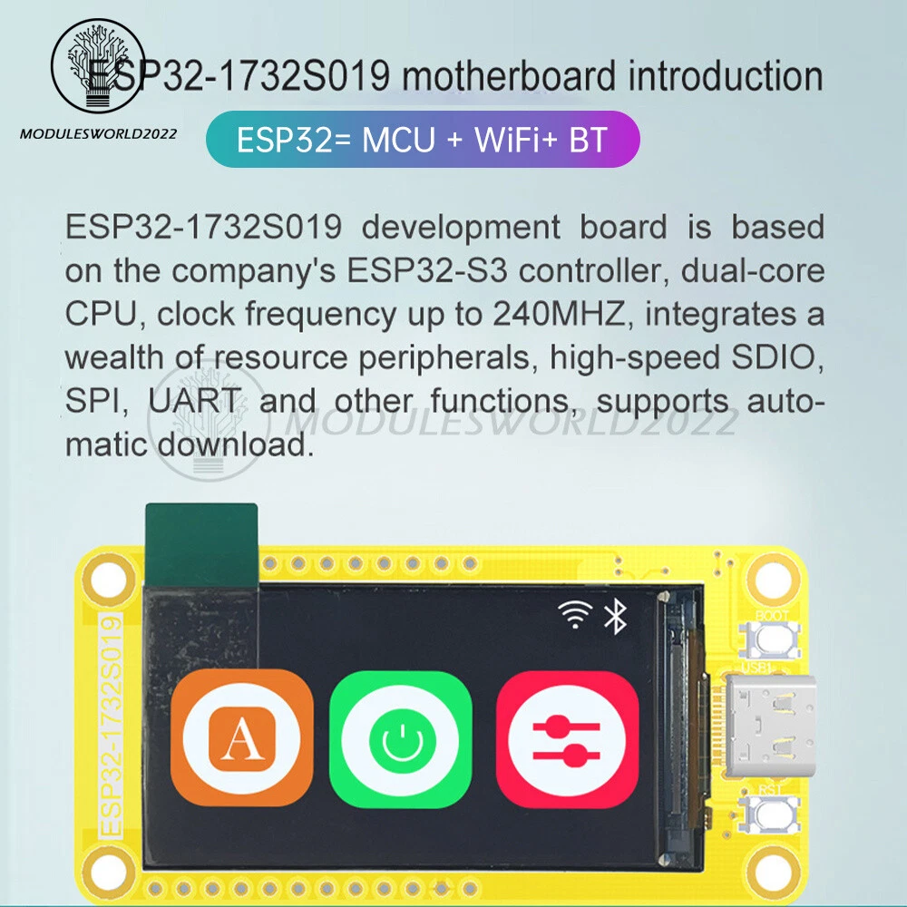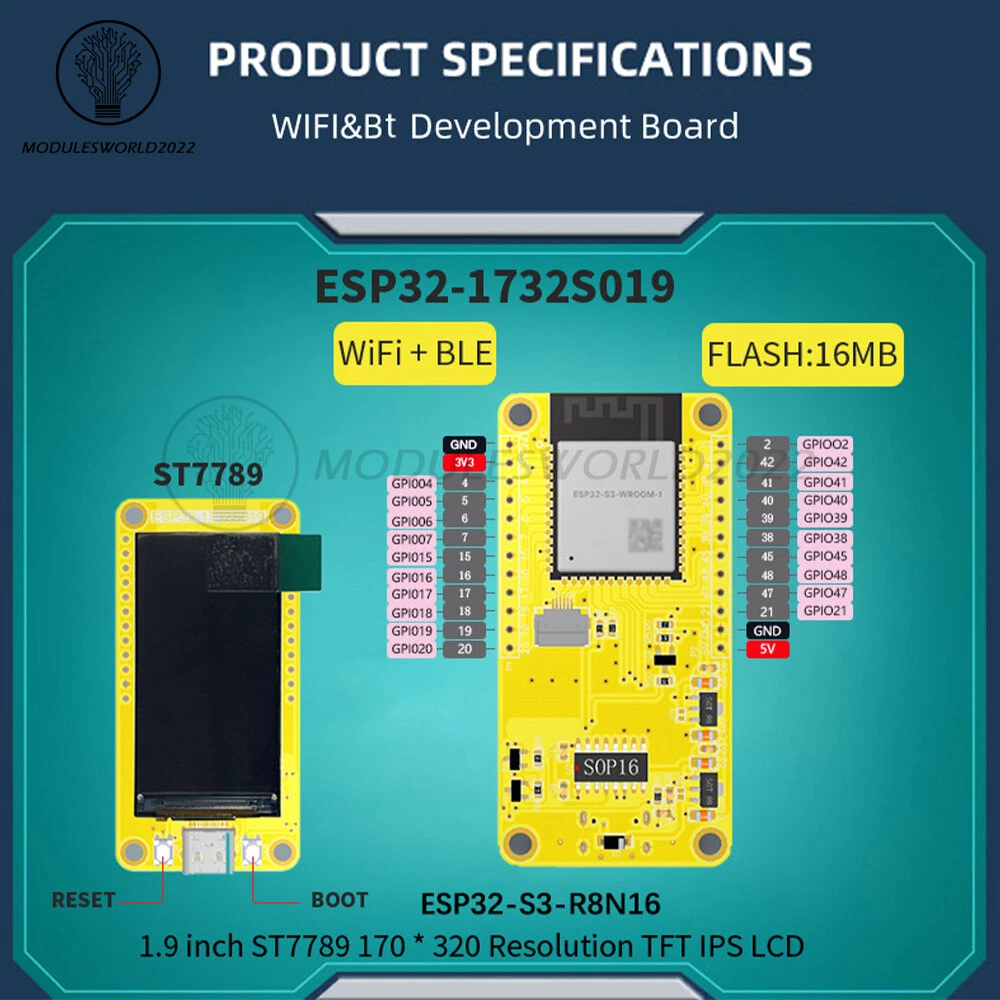 Store Categories Store Categories Other Product View Details Overview Development board module adopts ESP32-S3-WROOM-1 module as the main control, the main control is a dual-core MCU, integrated WI-FI and Bluetooth functions, the main frequency up to 240MHz, 512KB SRAM, 384KB ROM, 8M PSRAM, Flash capacity of 16MB, display resolution of 170*320 IPS display without touch. 512KB SRAM, 384KB ROM, 8M PSRAM, Flash capacity of 16MB, display resolution of 170*320 IPS display, no touch. The module includes LCD display, backlight control circuit, IO port interface and supports development in arduino IDE, ESP IDE, Micropython and Mixly. Features 1.1.9 inch color screen, support 16 BIT color display, display colorful 2. Factory programmed, can be inserted into the sample program 3. With TF card slot, easy to expand storage space 4. Provide library functions and sample programs, easy to quickly carry out secondary development 5. Support one-key download program, long-term stable work Specification Product name: ESP32-S3 development board Driver chip: ST7789 Display size: 1.9 inch Resolution: 170 * 320 pixels Main control chip: ESP32-S3 FLASH: 16MB Communication: WiFI+BLE Clock frequency: 240MHz Supply current: 120mA Supply Voltage: 5V Interface: Type-C interface Operating Temperature: -20℃~70 Storage Temperature: -30℃~80℃ Note: Screen without touch function! Package includes 1 x Development Board 2 x Pin Shipping Policy Payment Method Returns Policy Shipping Policy Payment Method Returns Policy Home Payment Shipping About us Contact us Copyright©2018 datacaciques Home Payment Shipping About us Contact us Store Categories Store Categories Other Product View Details Overview Development board module adopts ESP32-S3-WROOM-1 module as the main control, the main control is a dual-core MCU, integrated WI-FI and Bluetooth functions, the main frequency up to 240MHz, 512KB SRAM, 384KB ROM, 8M PSRAM, Flash capacity of 16MB, display resolution of 170*320 IPS display without touch. 512KB SRAM, 384KB ROM, 8M PSRAM, Flash capacity of 16MB, display resolution of 170*320 IPS display, no touch. The module includes LCD display, backlight control circuit, IO port interface and supports development in arduino IDE, ESP IDE, Micropython and Mixly. Features 1.1.9 inch color screen, support 16 BIT color display, display colorful 2. Factory programmed, can be inserted into the sample program 3. With TF card slot, easy to expand storage space 4. Provide library functions and sample programs, easy to quickly carry out secondary development 5. Support one-key download program, long-term stable work Specification Product name: ESP32-S3 development board Driver chip: ST7789 Display size: 1.9 inch Resolution: 170 * 320 pixels Main control chip: ESP32-S3 FLASH: 16MB Communication: WiFI+BLE Clock frequency: 240MHz Supply current: 120mA Supply Voltage: 5V Interface: Type-C interface Operating Temperature: -20℃~70 Storage Temperature: -30℃~80℃ Note: Screen without touch function! Package includes 1 x Development Board 2 x Pin Shipping Policy Payment Method Returns Policy Shipping Policy We will arrange shipping for you within 24 Hours after payment cleared except the holidays. -We ship items to Worldwide. Thank you! -we will ship out the order in 1-2 business days after payment cleared .Since it is international shipping ,delivery time is about 15--28 business days to arrive to most countries. Payment Method We accept PayPal payment ONLY, and must be received within 5 days from the date of purchase. 2. It is easy and safe for you to pay by credit cards, debit cards, bank transfers and PayPal account balances. 3.Buyers are responsible for import duties,custom fees and taxes, if any, please check your country. Returns Policy 1.We believe our items are so outstanding. We are convinced you will be happy with your Purchase. 2. If you do not satisfy with our items. Please simply return to us within 30 Days in original condition. Just pay for the returned postage. Then we can issue full refund or resend the item to you after the returned item arrived at our warehouse. 3. Please include your eBay ID and item number with any email requests.