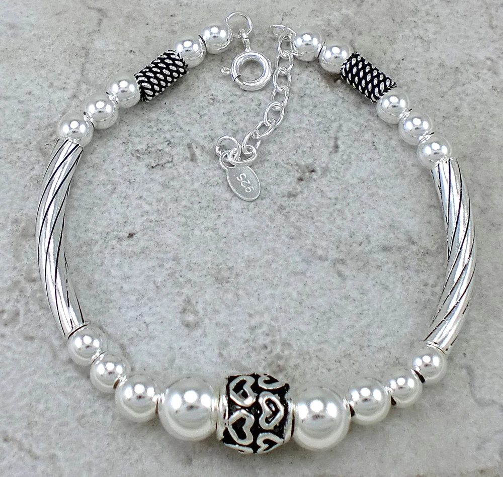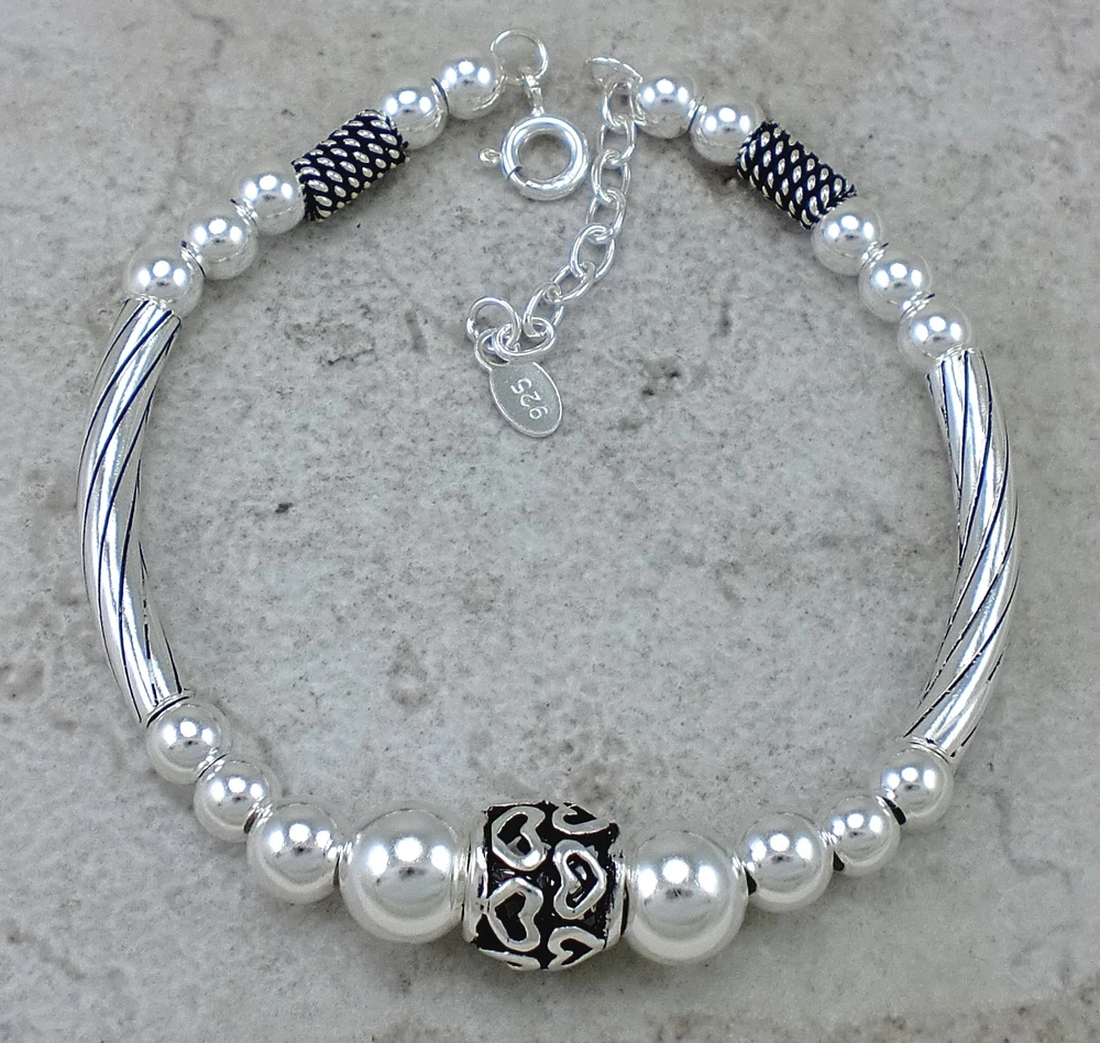 DETAILS size 7 inches dimensions 10mm wide approximate weight 12.5 grams retail value $110.00 part no. br303 you are bidding on a cute sterling silver bali style beaded bracelet. This pretty bracelet has a 10mm silver ball in the center with a mix of beads and bars. This bracelet is adjustable from 7 to 7 1/2 inches long with the additional chain and C clasp. The beads have a beautiful antique finish that will compliment anything in your silver collection. to view all listed items in the same style click here to see them in my EBAY store this auction is for the item and size specified only all our merchandise is sterling silver and stamped .925 Flat shipping rates: we charge a flat rate of $4.50 per order within US for items ending within 7 days from 1st to last item. All items must be paid together to receive shipping discounts. domestic shipping rates (US address) 1st item additional items USPS 1st Class mail $4.50 free USPS Priority mail $9.00 free packing and shipping: all orders will ship by the next business day after payment is received Monday to Friday except holidays. All items are sent in a padded envelope for security and protection about us: We have been selling the finest sterling silver jewelry at wholesale prices exclusively on ebay for over 10 years. Customer service: Good service is very important to us!!!! Our goal is to provide you with accurate descriptions and detailed pictures of the highest quality sterling silver jewelry to help you in your purchase. return policy: if for any reason you are not satisfied with your purchase contact us within 7 days of receipt, and return the item within 30 days for a full refund of the purchase price.(shipping fees will not be refunded) Feedback: we appreciate all positive feedback and we will automatically leave positive feedback for all customers who have left positive feedback for the transaction. please do not use feedback to relay a message to us, if you have a problem with anything contact us first thru ebay messages .