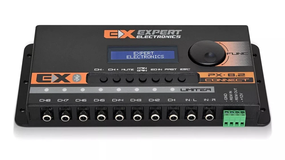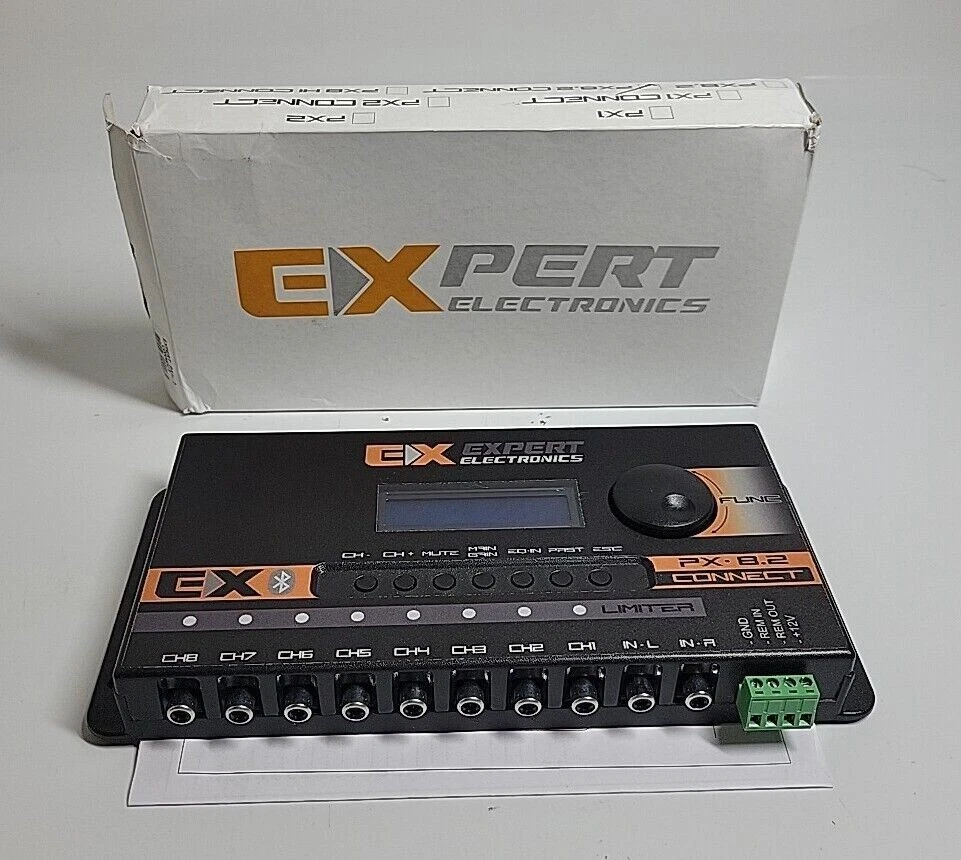Description • 8 output channels • Channel routing • 15 bands of input equalization • 3 bands of parametric equalization per channel • Mute, Phase, Limiter, Gain, Delay and Reset • Bluetooth interface • Preset with all settings INCLUDED ITEMS: • 1 PX8.2 Connect Processor DESCRIPTION: Quality automotive sound doesn't have to be expensive, with the PX8.2 Connect audio processor from Expert Electronics you bring together several functions in a single piece of equipment, manufactured with high technology and quality. Combining versatility and power, it is an audio processor, equalizer with more than 15 programmed frequencies and crossover, allowing you to program and control gain, phase, delay and several other parameters for a perfect and much stronger sound. And it also has a Bluetooth connection for configuration with a Smartphone via the Android or IOS App. Mark your presence with professional sound quality and enjoy one of the best items on the market in terms of technology and value for money. TECHNICAL DATA: • Brand: Expert Electronics • Model: PX8.2 Connect • Channels: 8 • Bluetooth interface: Yes (configuration only) • Compatibility: All versions of IOS and Android 4.3 or higher • Input equalizer: 15-band Yes • Parametric equalization: Yes 3 bands per channel • Input type: unbalanced • Input connection: Rca • Max input level: 2 Vrms • Input impedance: 47 Kohm • Output type: unbalanced • Output Connection: Rca • Max output level: 10 Vpp (3.5 Vrms) • Output impedance: 470 ohm • Resolution: 24 bits • Sampling frequency: 48 Khz • Processing latency: 1.08 ms • Frequency response: 15 Hz to 22 Khz (-1 dB) • THD+N max: 0.01% • Signal to noise ratio: 100 dB • Supply voltage: 10~15 Vdc • Consumption: 300 ma (4 W) • Internal fuse: 2 A • Dimensions: 120 x 250 x 30mm • Weight: 0.42kg