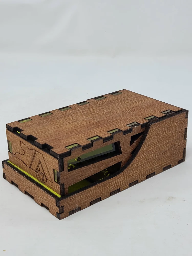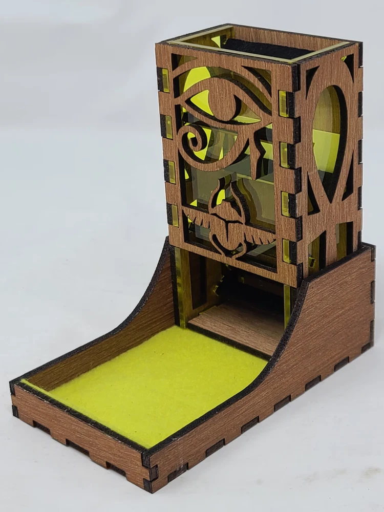EYE OF RA Dice Tower Tray wood & acrylic nesting portable tabletop games DND This simple, yet elegant dice tower does a wonderful job of keeping your dice in the tower, rather than crashing across your tabletop or rolling onto the floor! Length: 5 1/8 in Width: 3 in Depth: 1 2/4 in Accommodates standard 6 sided die, DND 7 piece dice set (including 20 sided die). Folds up for easy storage and portability in your pocket, bag or backpack. Felt covered baffles and dice tray reduce the sound of the dice rolling. Please visit our store to purchase other dice towers, as well as our MTG Deck Boxes. We develop new products through Kickstarter regularly so please check back for more items soon! We will combine shipping costs for multiple items if requested.