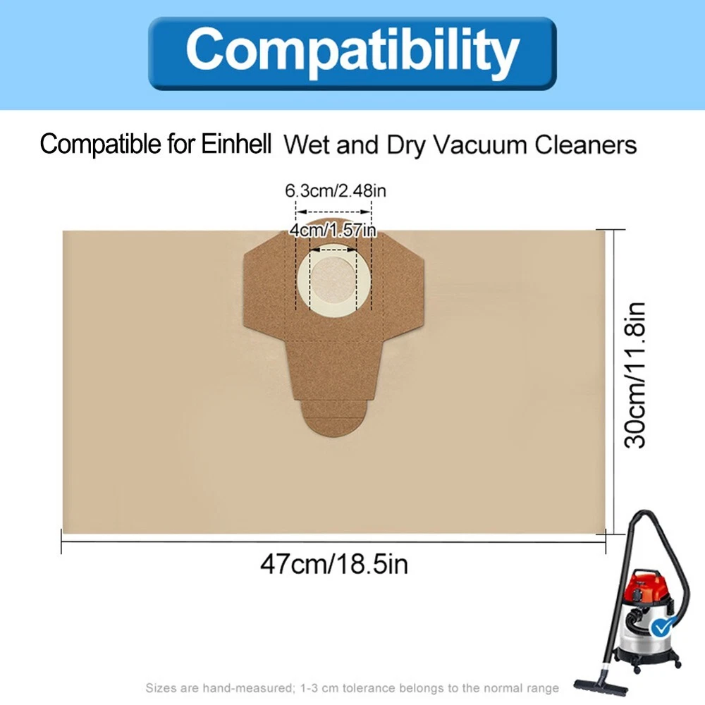 Easily Replaceable Vacuum Cleaner Bags Compatible with For Einhell Models DESCRIPTION Features: *Compatibility: These vacuum bags are specifically designed to fit for EINHELL Wet and Dry Vacuum models *Material: Constructed from high-quality paper, these bags are engineered to withstand both wet and dry debris, providing effective filtration for various cleaning tasks. *Convenient Pack Size: Each pack contains five bags, offering an economical solution for maintaining your vacuum without the need for frequent replacements. *Easy Installation: The bags are designed for straightforward installation, allowing you to quickly replace them without any tools or complicated procedures. *Enhanced Filtration: The design of these bags promotes better airflow and efficient dust capture, helping to maintain a cleaner environment while prolonging the life of your vacuum. Specifications: Product Name:Wet and Dry for Vac Bags Materi al:paper Size:as shown C olor:as shown Capacity: 20 litres Compatible devices: 2342167, 2342175, 2342341, 2342425, 2347130 Fitment: for Einhell Wet and Dry Vacuum/ BT-VC 1250S and 1250, For Einhell BT-VC1250S, TC-VC 18/20 Li S-Solo Number of Pieces:5 Package Content: 5* Wet and Dry for Vac Bags Note: 1. The real color of the item may be slightly different from the pictures shown on website caused by many factors such as brightness of your monitor and light brightness. 2. Please allow slight manual measurement deviation for the data. POLICES Shipping Payment WARRANTY We only ship to confirmed ebay Order addresses. Please comfirm that your Order address is in line with your shipping address. Please kindly note that the c ombined shipping is not provided because the shipping fee is calculated by weight. Also, the each additional item means exactly the the same color and size. It takes about 7 -15 working days to US; about 10-30 working days to other countries. Transit time may be a little delayed because of the bad weather and customs inspection . If you do not receive your item within 30 working days since payment finished, please contact us immediately for further assistance. Payment must be completed within 5 days. If you have any problems about payment, please contact us via ebay message. We strive for 100% customer satisfaction! Positive Feedback is very important to us. If you have any questions, p lease feel free to contact us via "Ask seller a question" . We will reply your email within 24 working hours. On Dec 18, 2024 at 22:41:22 PST, seller added the following information: