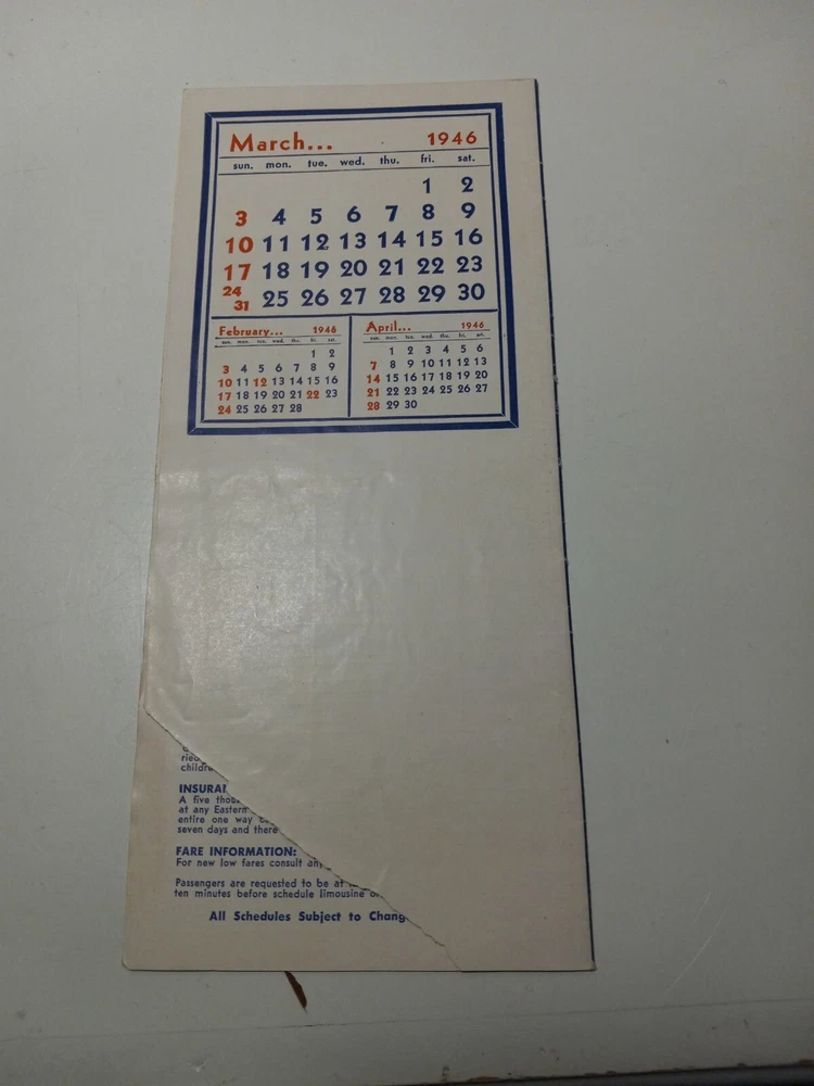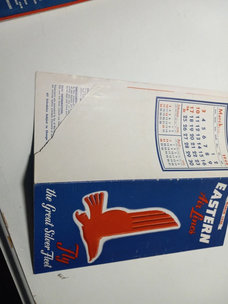 Eastern Airlines March 1946 Time Table Route Map Fly the Great Silver Fleet Tear on back cover/missing edge. Great otherwise. Satisfaction guaranteed.