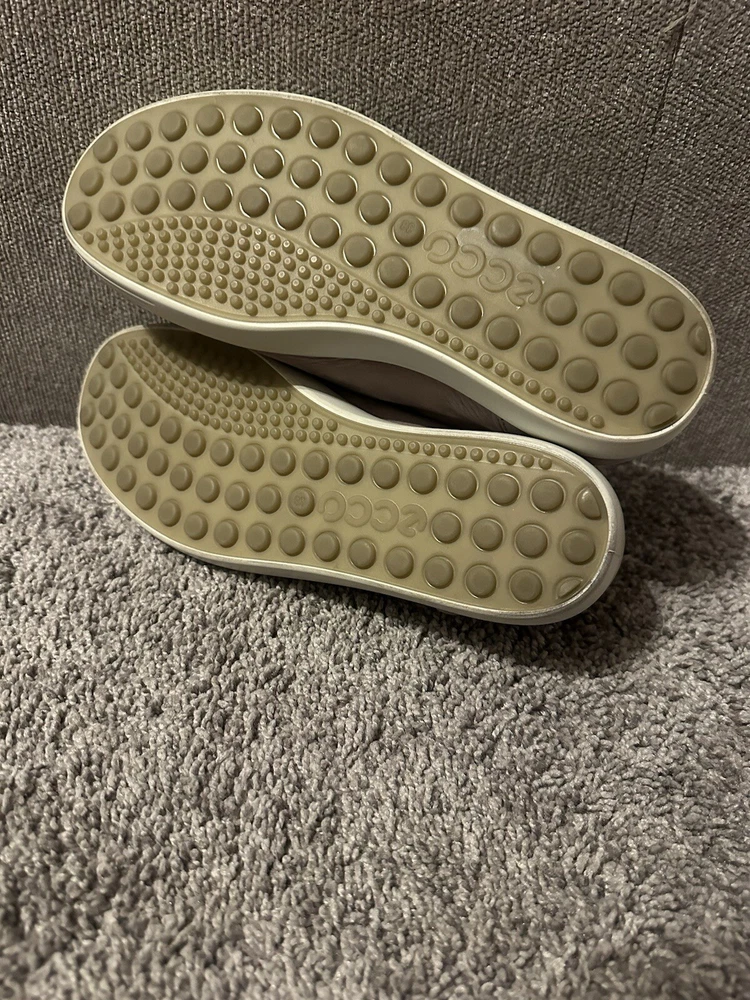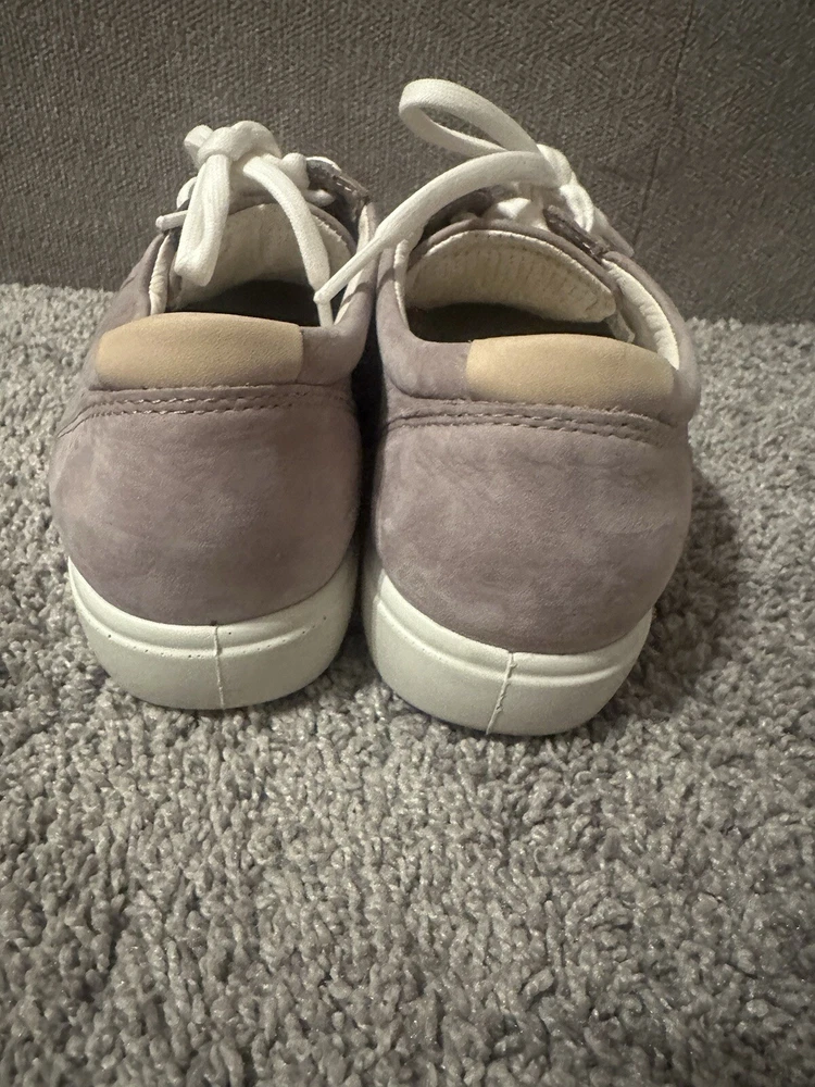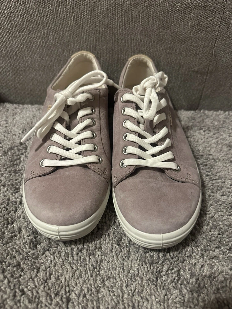 Elevate your athleisure game with these ECCO Women's Lavender Leather Lace Tennis Shoes. The solid pattern and purple color with logo accents add a touch of style to your everyday workout routine. These sneakers are designed with a comfortable cushioned insole and rubber outsole for optimal performance during tennis games or any other athletic activity. The shoes are available in UK size 5.5, US size 7, and EU size 38, with a medium width. The leather upper material and lace-up closure provide a secure fit, while the leather insole ensures added comfort. These sneakers are perfect for women who love to stay active and look great doing it. Preowned Good Condition