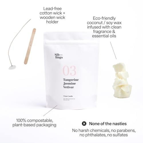 Return Policy Fast Delivery Trusted seller Candle Refill Kit, DIY Candle Kit (No 03: Tangerine, Jasmine, Vetiver) - Eco-Friendly, Clean Fragrance, Coconut & Soy Wax Product Description Siblings Essentials, Candle Refill Kit, DIY Candle Kit (No 03: Tangerine, Jasmine, Vetiver) - Eco-Friendly Candle Refill, Clean Fragrance and Essential Oils, Coconut and Soy Wax REFILL YOUR FAVORITE CANDLE VESSELS FOREVER: Siblings Essentials DIY at home candle kit is easy to create! It also makes the perfect gift for birthdays, holidays, house warmings, host gifts and more. Each candle refill kit will last up to 60 hours of burn time HOW IT WORKS AND WHAT IS INCLUDED: Includes a wick and wick holder; melt the wax in the bag, pour it into your favorite vessel, let it set, light and enjoy! Use heat-resistant tumblers, cups, or jars that won’t leak, crack, or catch fire. SIBLINGS ESSENTIALS IS A CLIMATE FIRST COMPANY: We are focused on reducing our impact. Sustainability drives us to cut our carbon footprint, create long-lasting products, and use eco-friendly, circular systems. SUSTAINABILITY IS OUR FOCUS: Our candles come in 100% compostable bags. Our manufacturer offsets packaging impact by removing ocean plastic. We use plastic-free, recyclable shipping materials. Coconut blend wax burns longer, using fewer resources. Our fragrances are free from harsh chemicals, with traceable essential oils. We encourage vessel reuse, and ours are built to last. We’ve offset our carbon emissions with Pachama since 2019. Shipping Returns Payment Shipping Shipping is FREE to all addresses other than APO/PO boxes in the lower 48 states. All our stock ships from US-based warehouses. Shipped via USPS or UPS (depending on location and package weight) Unless stated otherwise, all orders will ship within 24-72 hours of your payment being processed. Check our feedback to see the great reviews of FAST shipping we offer. Returns Seller does not accept returns Payment We currently accept payment via eBay managed payments only. Once payment is cleared, we will dispatch your shipment within 1-3 business days. Please refer to the "Shipping" tab for more information regarding shipping speed to your destination.
