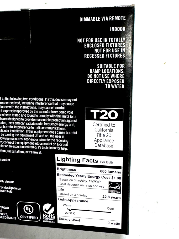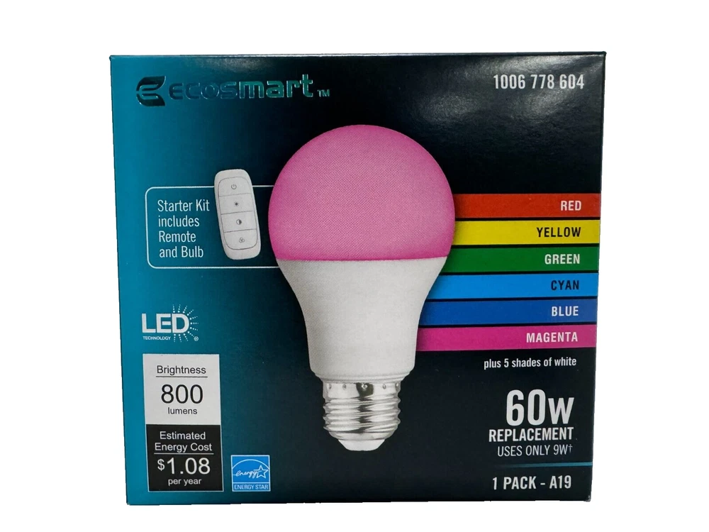 Ecosmart 60W LED Bulb, Color Changing A19 with Remote This energy efficient color changing A19 LED light bulb kit includes a Bluetooth remote that is used to control all the features of the bulb. The A19 LED bulb has several shades of white and a range of colors to choose from. Simply hold down the button on the included remote to change from Soft White (2700K) to Daylight (5000K). Another button on the remote, can be held down to cycle through 6 colors in a variety of shades. The LED A19 bulb is also dimmable via the included remote. Pair up to 15 bulbs to one remote. Light. Your Way. LED lightbulb uses 81% less energy compared to standard incandescent light bulb Energy Used: 9-watts (equivalent to a 60-Watt incandescent light bulb) Dimmable via included remote (not suitable for use with wall switch dimmers) Tunable White from 2700K to 5000K and Color changing 90 CRI ensures color accuracy and clarity for the highest quality of light available LED light bulb does not contain mercury Suitable for use in enclosed fixtures Estimated yearly energy cost: $1.08 (based on 3-hour/day, $0.11/kWh, costs depend on rates and use) Pair up to 15 bulbs to a single remote At GoodBye Retail, we take pride in delivering your orders promptly and efficiently. Please review the following shipping details to ensure a seamless shopping experience: Order Processing: Orders are processed and shipped within 24 business hours of your purchase. If your order is placed before 1 PM EST Monday through Friday, it will be shipped on the same day. Orders placed after 1 PM EST will be shipped the following business day. For orders made during the weekend (Saturday/Sunday), they will be shipped on the following Monday, excluding federal holidays. Shipping Options: We offer up to three (3) shipping options for most orders within the U.S.: Economy Shipping: This option allows the courier a maximum of 10 full business days for delivery. Standard Shipping: Typically, this method takes between 3-7 business days for delivery. Expedited Shipping: For those in a hurry, expedited shipping usually takes between 2-5 business days. Please select your preferred shipping method during the checkout process. Be mindful that once your order is placed, we are unable to modify the chosen shipping method. Delivery Estimates: While eBay provides estimated delivery dates, please note that these are approximations. Delays can occur due to factors beyond our control, such as extreme weather conditions, natural disasters, and peak seasonal demand. Shipping Carriers: To ensure the safe and efficient delivery of your orders, we utilize reputable carriers, including UPS Mail Innovations, FedEx Ground and SmartPost, and USPS. The choice of carrier is determined by the package's size and weight. For your convenience, please be aware that both UPS Mail Innovations and FedEx SmartPost handle the transportation of packages to your local USPS for final delivery. Rest assured, we dispatch all orders within 24 business hours. Tracking information may take up to 72 hours to be uploaded and synchronized between eBay and the courier's website. We appreciate your patience during this process. Signature Confirmation: For orders valued at more than $150, we include signature confirmation as an extra layer of security to ensure your package is delivered safely. Shipping Address: Once an order is placed, we regret that we cannot alter the shipping address. We strongly recommend verifying that your preferred shipping address is accurate before finalizing your purchase during checkout. At GoodBye Retail, your satisfaction is our priority. If you have any inquiries or require further assistance with your order, please do not hesitate to contact our dedicated customer support team. Before leaving negative feedback, we kindly request that you contact us. Our team is committed to resolving any issues with your order to ensure you have a positive shopping experience with us. Thank you for choosing GoodBye Retail. We appreciate your trust in us for your shopping needs. California Energy Commission Title 20 Compliant LED Light Bulb