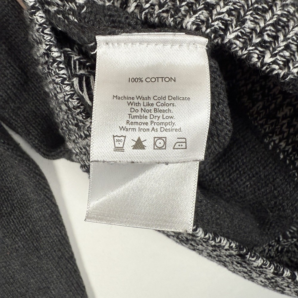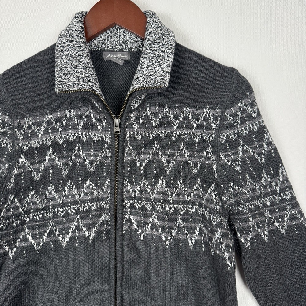 This womens eddie bauer sweater is size small and is contructed of a heavy knit 100% cotton. It features: Zigzag light gray pattern on dark gray sweater Chunky Knit Fabric Stand Up/Fold Down Ribbed Collar, sleeve and waistline Full Zipper Measurments (laying flat): Pit to Pit: 18 Hips: 18 Length: 28 Thank you for looking at my listing, please feel free to message with any questions and I will do my best to answer them.