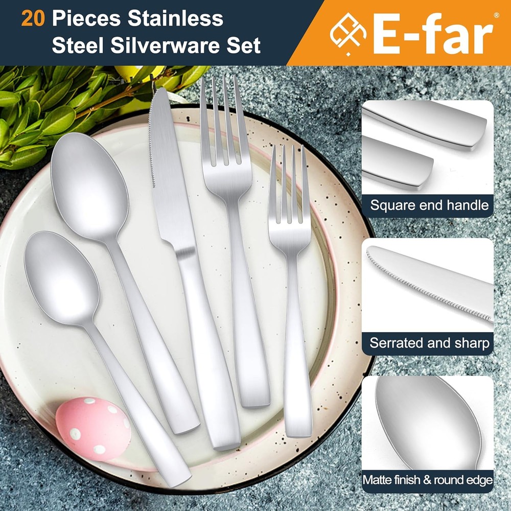 E-far Matte Silverware Set for 4, 20 Pieces Square handle, Silver Product Details Brand: E-far Number of Pieces: 20 Material: Stainless Steel Color: Matte Silver Product Care Instructions: Dishwasher Safe Recommended Uses For Product: Indoor, Outdoor Special Feature: Rust Resistant, Dishwsher Safe Finish Type: matte Included Components: 4 dinner forks, 4 dinner spoons, 4 dinner knives, 4 salad forks, 4 dessert spoons Style: Square handle Is Stain Resistant: Yes Is Dishwasher Safe: Yes Manufacturer: E-far Package Dimensions: 9.92 x 5.98 x 2.44 inches Item Weight: 2.81 pounds DURABLE STAINLESS STEEL: This 20 pieces tableware set are made of high-quality 18/0 stainless steel for anti-corrosion and rust free, Sturdy enough and not easily bent or damaged, Durable for long service life, Food grade stainless steel without harmful chemicals and nickel free, Non-toxic and healthy metal cutlery allows you to enjoy every meals COMFORTABLE TO GRASP: The silverware set has appropriate weight, suitable size and medium thickness just right to your hand, Ensure well balance and make you not easy to feel tired even holding for long time, Ergonomically-designed square end handle provide a suitable grip, make it feel comfortable in hands EFFORTLESS CLEANING: Dishwasher safe can free your hands, Save your time and labor with less hassle, make cleaning a breeze, Sleek line handle without any extra pattern, stain have nowhere to hide, Smooth surface for easy cleaning, Can remove the residue easily even by hand washing, Keep the flatware always looks like new ELEGENT AND WELL MADE: Classic square handle without any extra pattern makes the fork spoon and knife set looks elegant, Simple shaped silverware goes well with your existing tableware and decoration, Matte finished silverware are carefully sanded and turn out to smooth surfaces and round edges, Makes it safe to use without hurting your mouth MULTIPLE OCCASIONS: They’re perfect for family everyday meals and can use for more occasions: Gatherings, parties or BBQ, Also be a decent gift for wedding, housewarming, Thanksgiving, Christmas, birthday and more festivals, Suitable for business purpose to use at restaurants, hotels as well