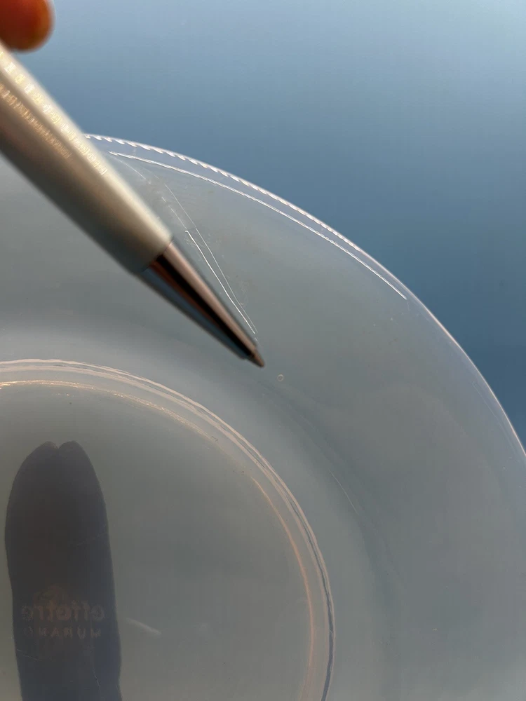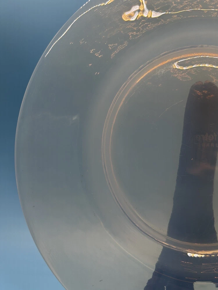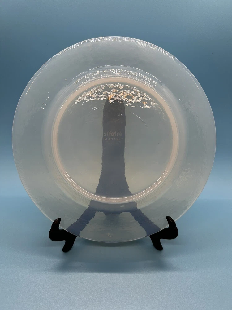 Add elegance to your table with this stunning 8-inch salad and dessert plate from Effetre Murano Italy. Expertly crafted with opalescent translucent glass, this plate is perfect for any occasion. Its unique design and high-quality material make it a one-of-a-kind addition to your collection. Ideal for serving salads, desserts, or appetizers, this plate is sure to impress your guests. The beautiful opalescent finish of the glass creates a mesmerizing effect, making it a great conversation starter. This plate is a must-have for anyone who loves to entertain or appreciates fine craftsmanship. This is a preowned item which may have various cosmetic blemishes, including signs of wear, dust, markings, and other imperfections due to its previous use, age, movement, and storage. There are also imperfections created when this dish was made. I’ve tried to highlight the spots I noticed. It should also be noted that color may vary from photos due to camera flash and/or computer monitor color variations. If condition concerns you, please review the images closely before purchasing, zooming in as necessary, as they should be considered part of the description. Questions are always welcomed! 10/54/11/23