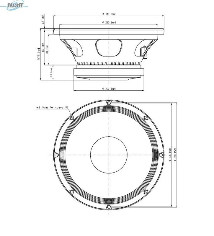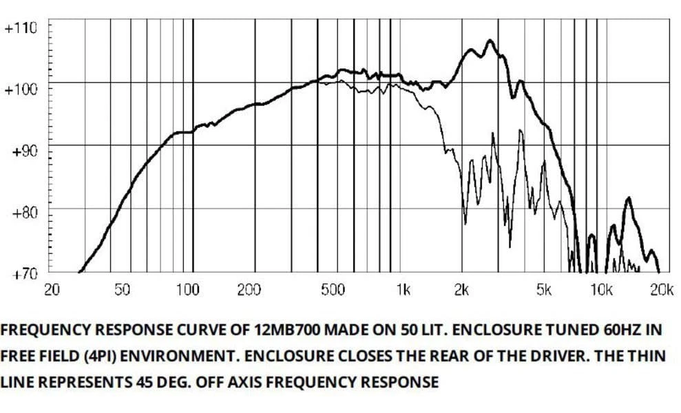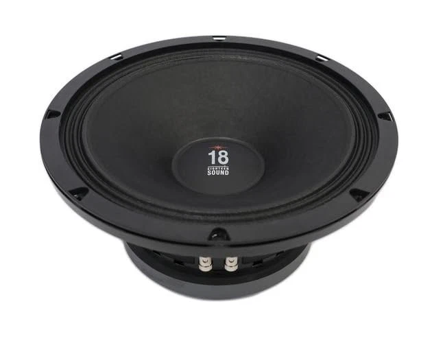 Eighteen Sound 12MB777-8 12-inch Mid Bass High Power Woofer Driver 8 Ohms Compact 2-Way Reflex Enclosure Weather Protected Cone and Plates for Outdoor Usage SPECIFICATIONS || || Nominal Diameter :: 300 mm ( in) || || Nominal Impedance :: 8 Ω || || Minimum Impedance :: 5.7 Ω || || Nominal Power Handling 1 :: 450 W || || Continuous power handling 2 :: 600 W || || Sensitivity (1W/1m) 3 :: 101.5 dB || || Frequency Range :: 60 - 5000 Hz || || Voice Coil Diameter :: 75 mm (3.0 in) || || Winding Material :: aluminum || * 101.5 dB SPL 1W / 1m sensitivity || * 75 mm (3 in) Interleaved Sandwich Voice coil (ISV) || * 450 W AES power handling || * Double Demodulating Rings (DDR) for lower distortion || * Improved heat dissipation via unique basket design || * Weather protected cone and plates for outdoor usage || * Ideal for compact two way and multiway systems || MOUNTING AND SHIPPING INFO || || Overall Diameter :: 315 mm (12.4 in) || || Bolt Circle Diameter :: 296 mm (11.65 in) || || Baffle Cutout Diameter :: 282.0 mm (11.1 in) || || Depth :: 147 mm (5.79 in) || || Flange and Gasket Thickness :: 16 mm (0.63 in) || || Net Weight :: 8.0 kg (17.64 lb) || || Shipping Weight :: 9.0 kg ( lb) || || Shipping Box :: 332 x 332 x 184 mm (13.07x13.07x7.24 in) || The 12MB777 is a very high sensitivity (101.5 dB 1W/1m) midbass driver with high power handling capabilities. It can be used as either a bass/mid driver in compact 2-way reflex enclosures or as a direct radiating or horn loaded, dedicated midrange driver, in multi-way touring and fixed installation concert and arena systems. Its curvilinear paper cone made from a special high strength wood pulp, has been designed to achieve the best possible linearity within its intended frequency range. The cone is carried by a multiroll suspension formed of a linen-like material, which is more resistant to aging & fatigue than traditional materials. The 75 mm diameter state-of-the-art voice coil is similiar to those fitted to our top-of-the-range 18-in and 15-in models but it is wound w/ aluminum wire. It employs our Interleaved Sandwich Voice coil (ISV) technology in which a high strength fiberglas former carries windings on both the outer & inner surfaces to achieve a mass balanced coil.
