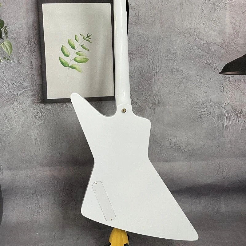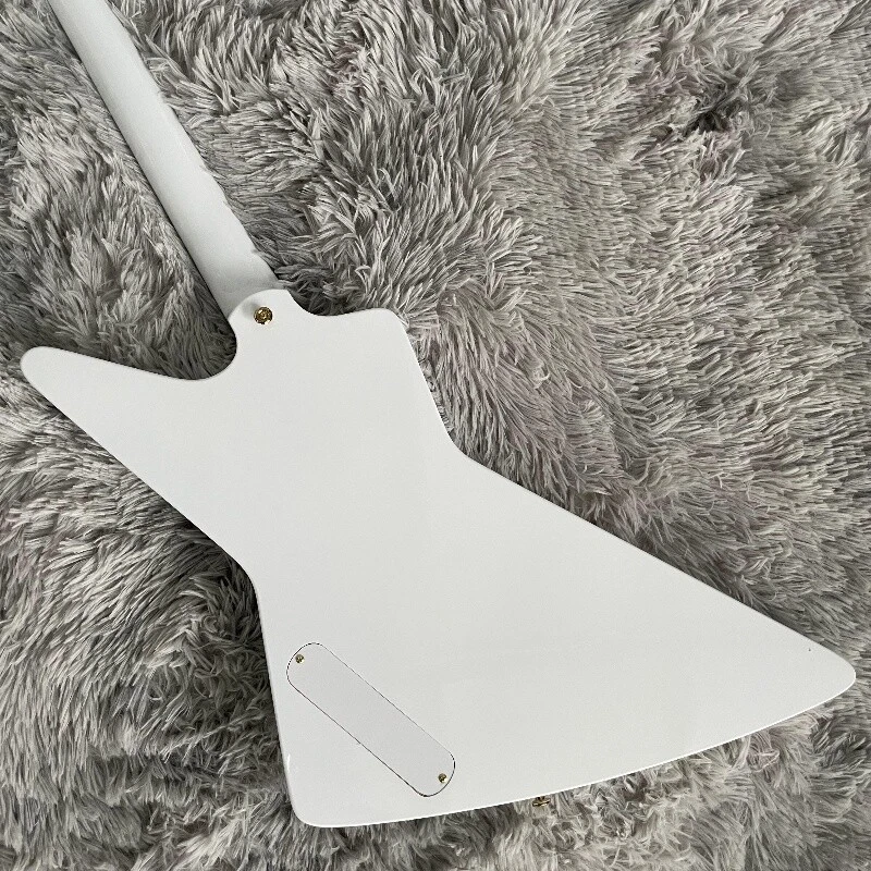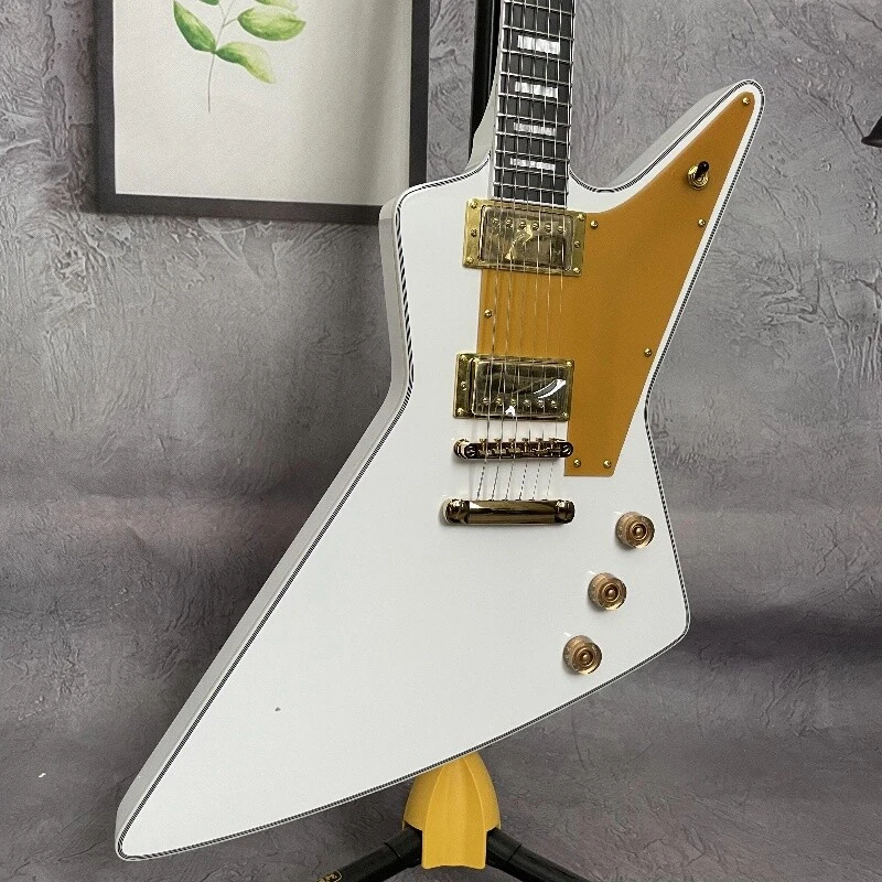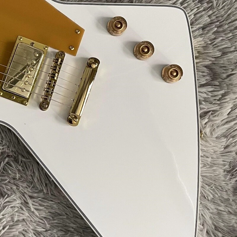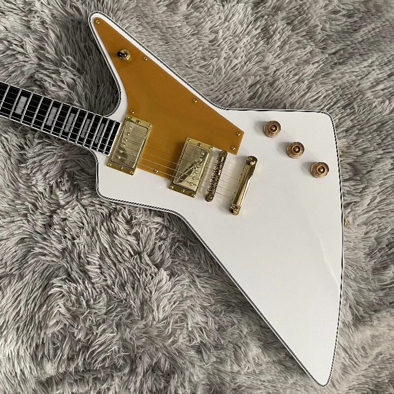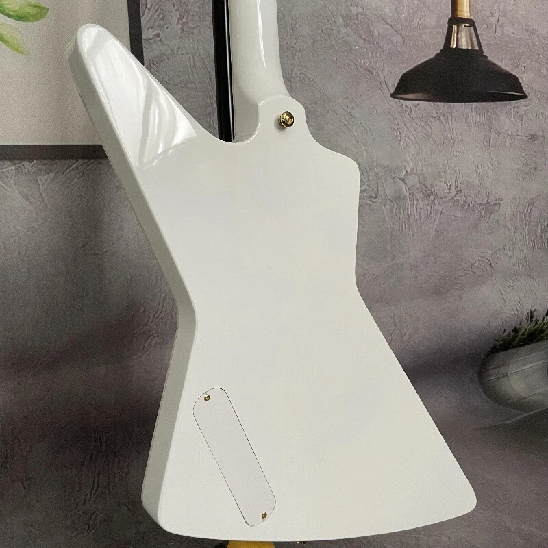 Electric Guitar White Explorer HH Pickups Gold Hardware Metallic Gold Pick Guard Body:mahogany Neck:mahogany Fingerboard:black Joint:Bolt on Pickups:2 humbuckers Electronic:1 Volume 2 Tone Bridge:T-O-M Nut width:43 mm ABOUT THE PICTURES The pictures are taken in our factories by ourselves. Every guitar cannot be the same in 100%, the pictures of the guitar that you see is just one of them. Head stocks are not pictured per our policy.If you want some details about the guitar, please contact me. OUR GUARANTEE We test every guitar is in good condition before it is shipped out. When you receive the guitar, if you meet some problems like readjustment the strings or you are not happy with our guitar, please contact me. PACKING We will place a foam box and foam filler to prevent damage to the guitar, but if the guitar is still broken in transit, please contact me. RETURN POLICY If the item you received is broken or defective, please contact me immediately and return it within 3 days after you received it with the original or approved packaging. After we received it, we will give you a Full-Refund or Exchange. Buyers are responsible for return shopping costs. If you want to replace it, we will send a new one to you and then forward a shipping label. For missing or replacement parts(from the original order), we will ship them to you. If you have any questions about a return or exchange,please contact me. FEEDBACK The new shop is not easy to operate, if you like our guitar, truly hope you can leave a good comment. If you are not satisfied, we will do our best to solve the problem. Thank you soooo much!
