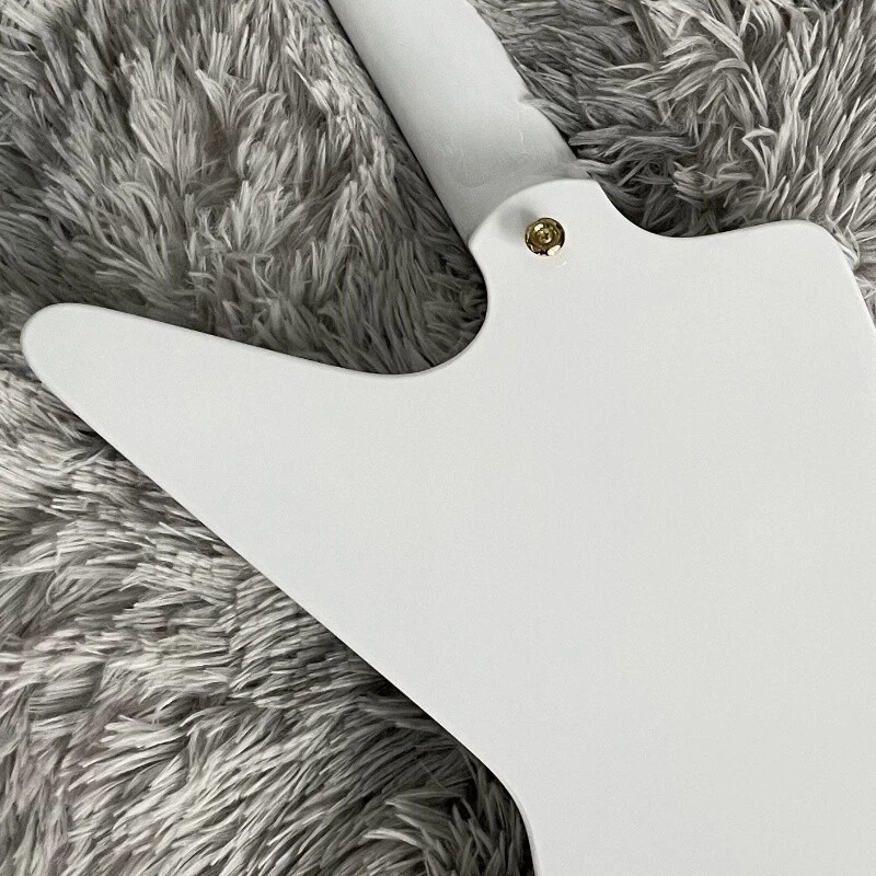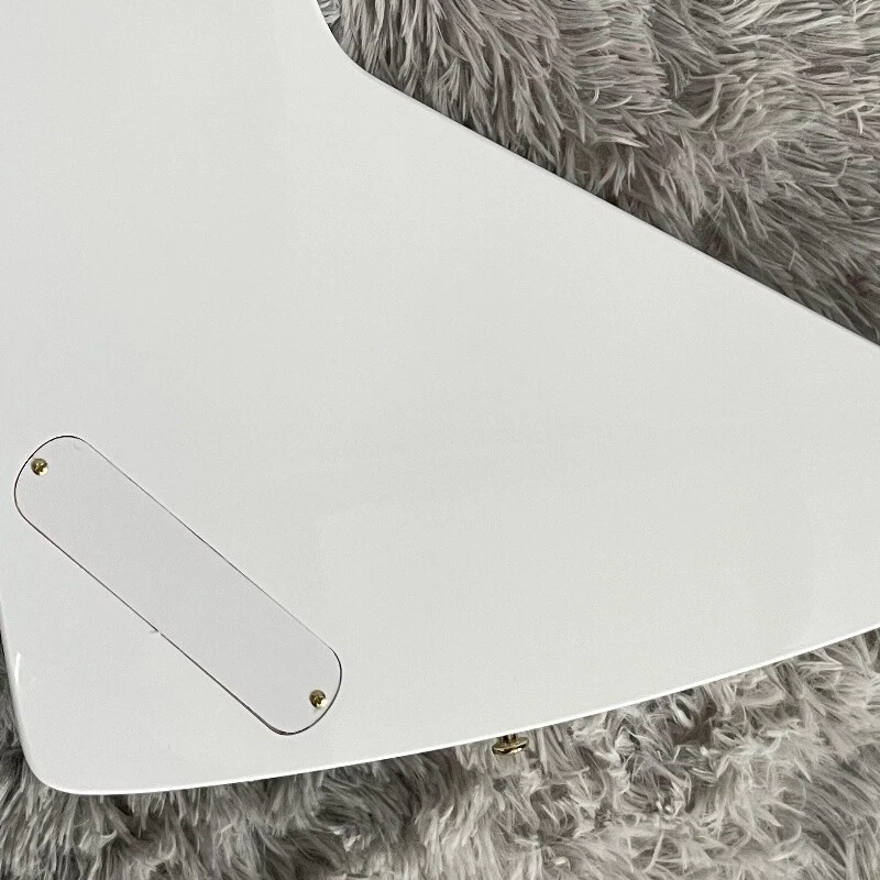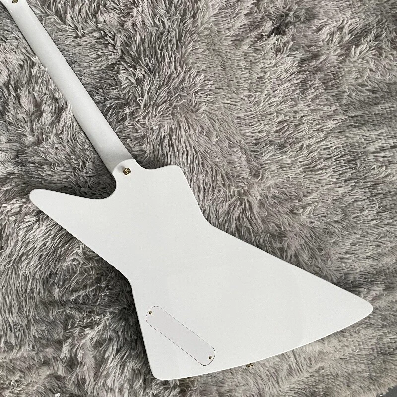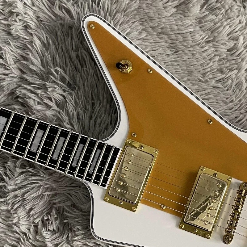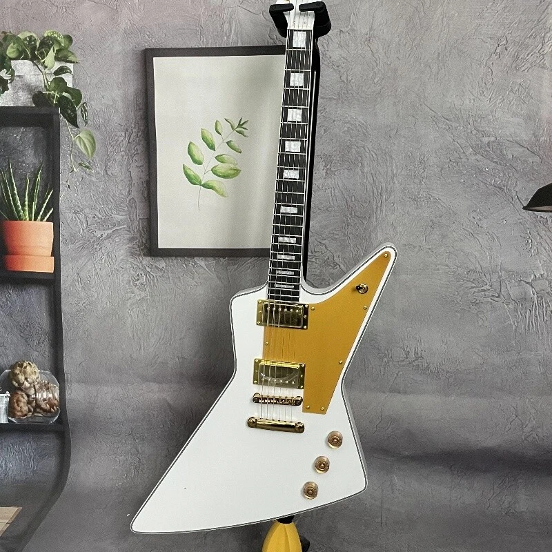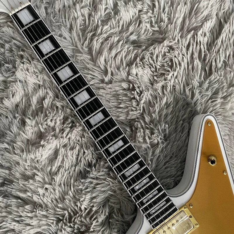 Electric Guitar White Explorer HH Pickups Gold Hardware Metallic Gold Pick Guard Body:mahogany Neck:mahogany Fingerboard:black Joint:Bolt on Pickups:2 humbuckers Electronic:1 Volume 2 Tone Bridge:T-O-M Nut width:43 mm ABOUT THE PICTURES The pictures are taken in our factories by ourselves. Every guitar cannot be the same in 100%, the pictures of the guitar that you see is just one of them. Head stocks are not pictured per our policy.If you want some details about the guitar, please contact me. OUR GUARANTEE We test every guitar is in good condition before it is shipped out. When you receive the guitar, if you meet some problems like readjustment the strings or you are not happy with our guitar, please contact me. PACKING We will place a foam box and foam filler to prevent damage to the guitar, but if the guitar is still broken in transit, please contact me. RETURN POLICY If the item you received is broken or defective, please contact me immediately and return it within 3 days after you received it with the original or approved packaging. After we received it, we will give you a Full-Refund or Exchange. Buyers are responsible for return shopping costs. If you want to replace it, we will send a new one to you and then forward a shipping label. For missing or replacement parts(from the original order), we will ship them to you. If you have any questions about a return or exchange,please contact me. FEEDBACK The new shop is not easy to operate, if you like our guitar, truly hope you can leave a good comment. If you are not satisfied, we will do our best to solve the problem. Thank you soooo much!