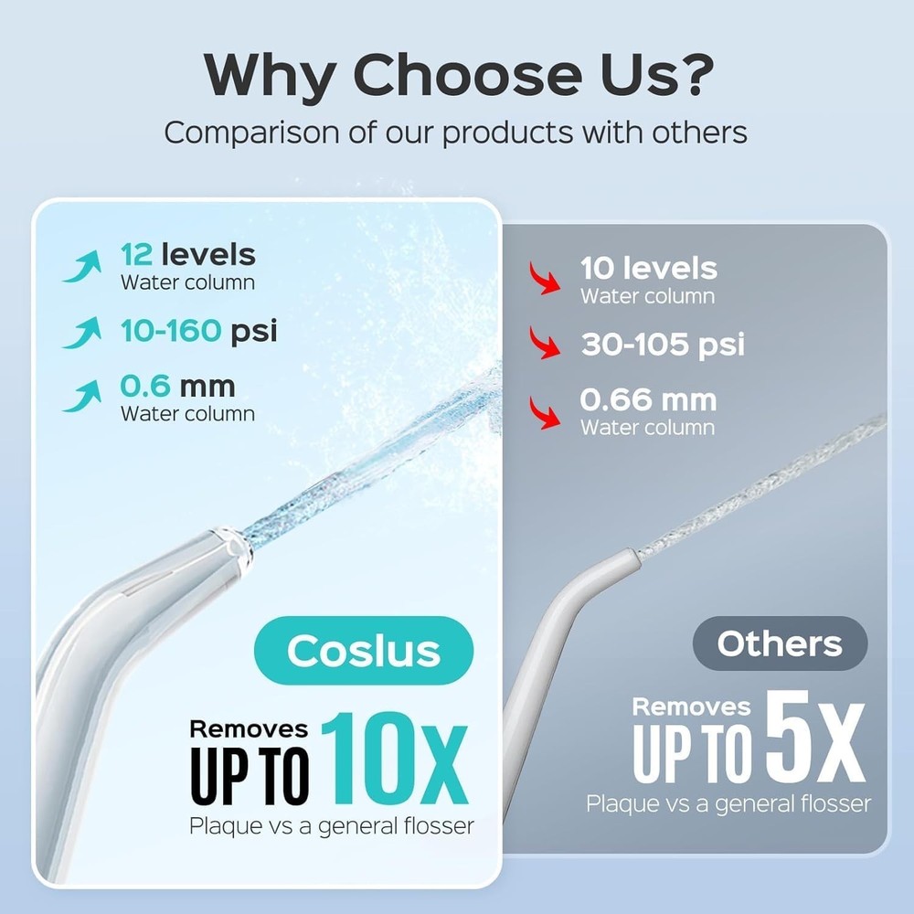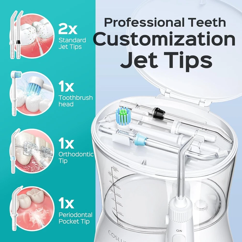 COSLUS Electric Water Flosser for Teeth: Professional Dental Pick for Orthodontic, Sensitive Gums, Braces - 12 Pressure Settings & 5 Multi-Functional Tips for Multiple Users, Home Use, White About this item Professional-Grade Oral Cleaning for Every Need: Developed by COSLUS in partnership with dental specialists, this electric water flosser delivers high-precision oral care for the whole family—whether it's teens with braces, adults maintaining dental hygiene, or seniors with sensitive gums. With 12 adjustable pressure settings (10–160 PSI), the water flosser ensures effective interdental plaque removal and food debris flushing. Ideal for daily oral care, orthodontic care, and long-term gum health maintenance, it’s a true bad breath eliminator built for everyday use. 12 Customizable Pressure Settings for Whole Family: Equipped with 12 precisely adjustable pressure levels, this COSLUS water flosser is designed to adapt to every age and need—from gentle gum care for children to deep cleaning for adults and wire cleaning for teens with braces. Its family-friendly sharing design supports multi-user households with consistent water flow for daily family oral care. Whether part of a morning routine or nighttime routine, this water flosser makes daily cleaning both safe and effective 600ML Large-Capacity Tank for Hassle-Free Routine: The COSLUS water flosser features a 600ML detachable tank that’s perfect for after-meal cleanups and daily oral care without constant refills. Supporting quick clean sessions for up to four users, it’s ideal for families with kids, parents, and grandparents. Designed for convenience in daily family oral care, this tank makes the water flosser a reliable solution for food removal, cavity prevention, and gum health—all from one compact family design 5 Multifunctional Jet Tips with Organized Storage: This water flosser includes 5 specialized jet tips tailored for different oral needs, including braces cleaning, tongue cleaning scenarios, and general oral care. With clearly organized storage and intuitive switching, it suits multi-user households, helping each family member—from children to elderly adults—address specific issues like bad breath or sensitive gums care. Whether you’re dealing with orthodontic maintenance or just need a quick clean, this setup ensures effortless family sharing Reliable Design with Practical Home Aesthetics: With a compact design and modern white finish, this COSLUS water flosser blends style and function for American homes. Its non-slip base, 3-minute auto shut-off, and easy controls support hassle-free integration into any daily routine. Whether you're prepping for the day or winding down, this water flosser supports both morning and nighttime routines with efficient gum health care. Its compact family design makes it ideal for shared spaces without sacrificing performance NOTES: Needs to be plugged in to a power source for use. Packaging may vary (new or old), but the contents are exactly the same Delivery within 3-4 days. Shipping as fast as possible Please contact if you have a question! HAVE A NICE SHOPPING