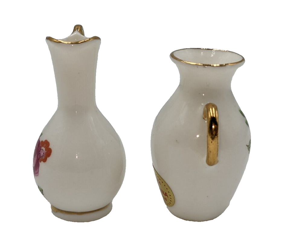 Dollhouse Miniatures Bone China Vase & Pitcher Hi Style By Bridge Japan 1.5". Excellent used condition - no damage at all. Please see the photos. These tiny white vases are decorated with pink and red roses and gold trim. All of my items are carefully packed for shipping, no matter their value - $5 items are wrapped with the same care as a $200 item. My goal is to have your purchase arrive safely. Large, heavy and fragile items are harder to use combined shipping with but just ask if you would like to purchase more than one item and I am more than happy to do so if feasible. Measurements are approximate or as close as I can get. Also, the color you see many not be the exact color depending on your computer or phone settings. Unpaid items will result in the buyer being blocked from further purchases. Please remit payment right away so we can get your item shipped out quickly.