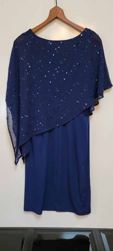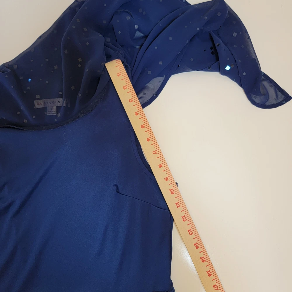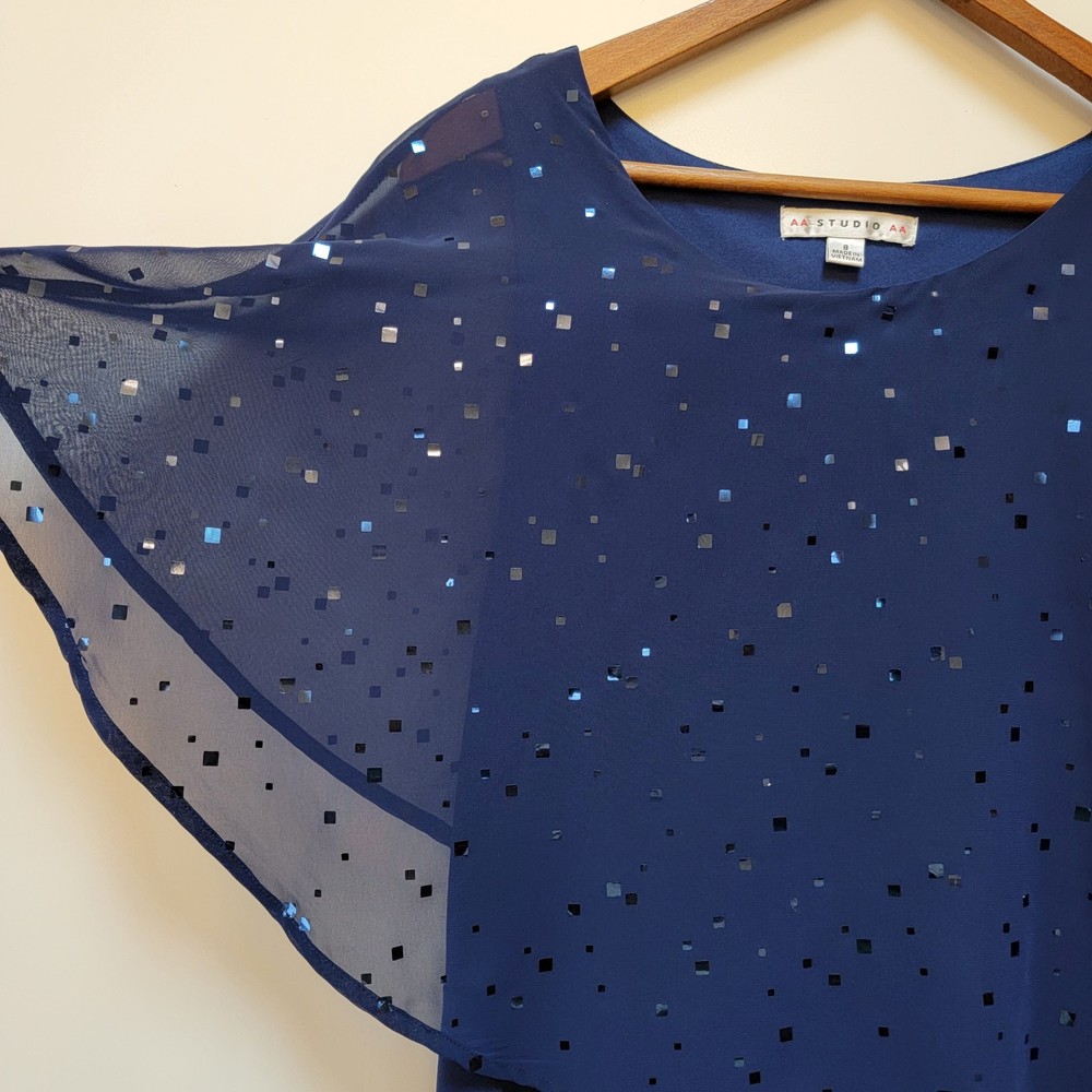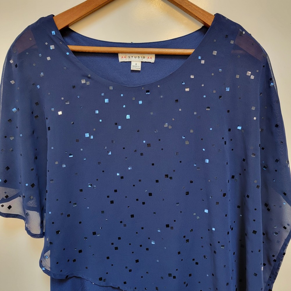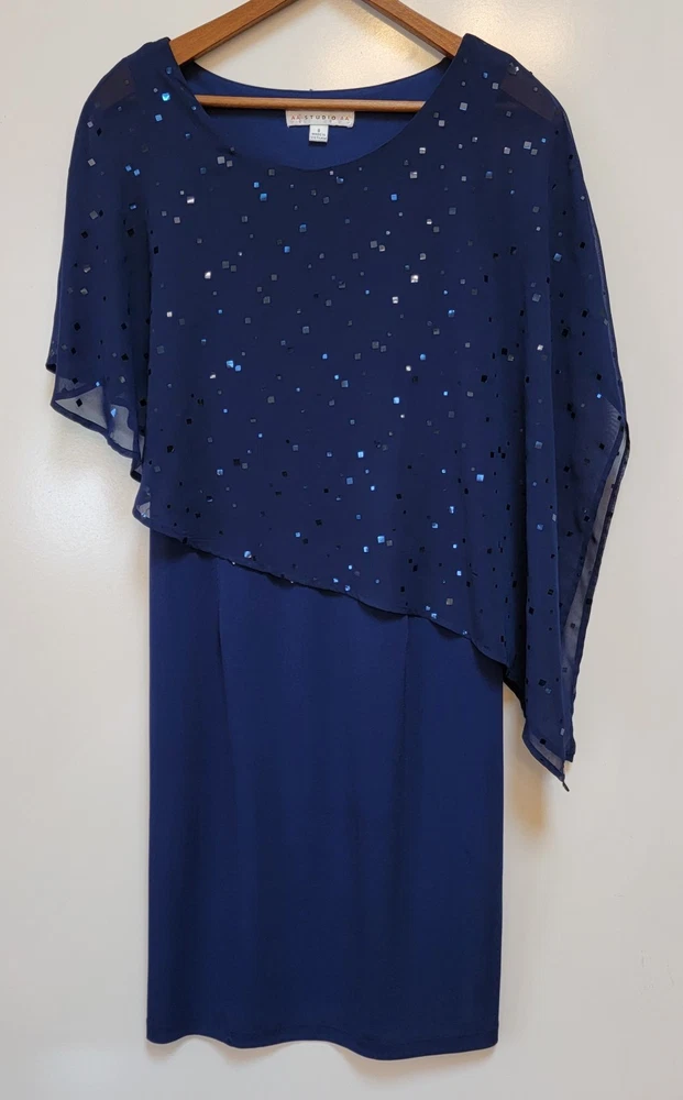 ~The AA Studio AA Elegant Navy Blue Dress features a round neckline, pullover closure, and featuring a sheer sequined overlay. ~The overlay has a cape-like design, draping over the shoulders and upper arms, adding an elegant touch with sequins scattered across the sheer fabric. ~Made from 95% polyester and 5% spandex, the dress is lightweight and perfect for formal occasions like weddings and cocktail parties. ~The dark blue color with sparkling sequin accents adds a touch of glamour, while the sheer shiny material gives it a luxurious look. ~Suitable for various seasons, this dress is sure to make a statement and turn heads wherever you go. ~ Items will need to be paid for within 4 days of purchase, or they will need to be relisted. ~ Shipments will normally go out on same day or next day depending on payment receipt. ~ Combined shipping upon request unless too fragile to do so. ~ I describe to the best of my ability, but not guaranteed, so questions are always welcomed. ~ My Items Come from Estates, Garage Sales, Antique Shops, Flea Markets, Private Sales, Overstocks, & my Own Personal Items, so please look at all the photos carefully. ~ Normally I wipe with a damp cloth before photographing but leave all the deep cleaning to the buyer. ~ Clothing will be cleaned and or steamed prior to posting, Per Ebay Policy ~ Not able to confirm if the items I purchase come from a smoke free pet /free home or business Please refer to and view photos closely before purchasing, for full item condition, details, measurements & any questions you may have as they serve as a major part of my description. Thanks for stopping to take a look, and thanks for your small business support!! Very much appreciated!! If there are any issues with an item you have purchased, please contact me after receiving it so that I can correct it if need be. 1967/CL/052825