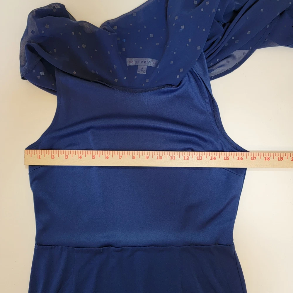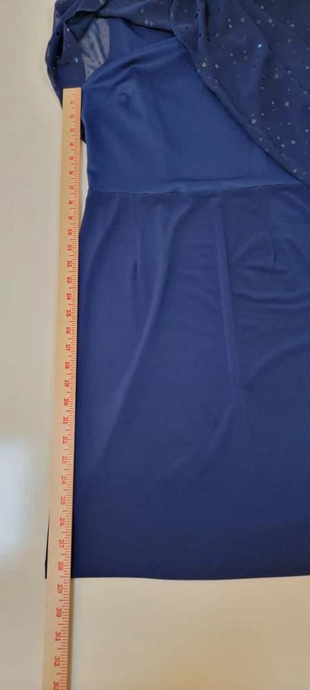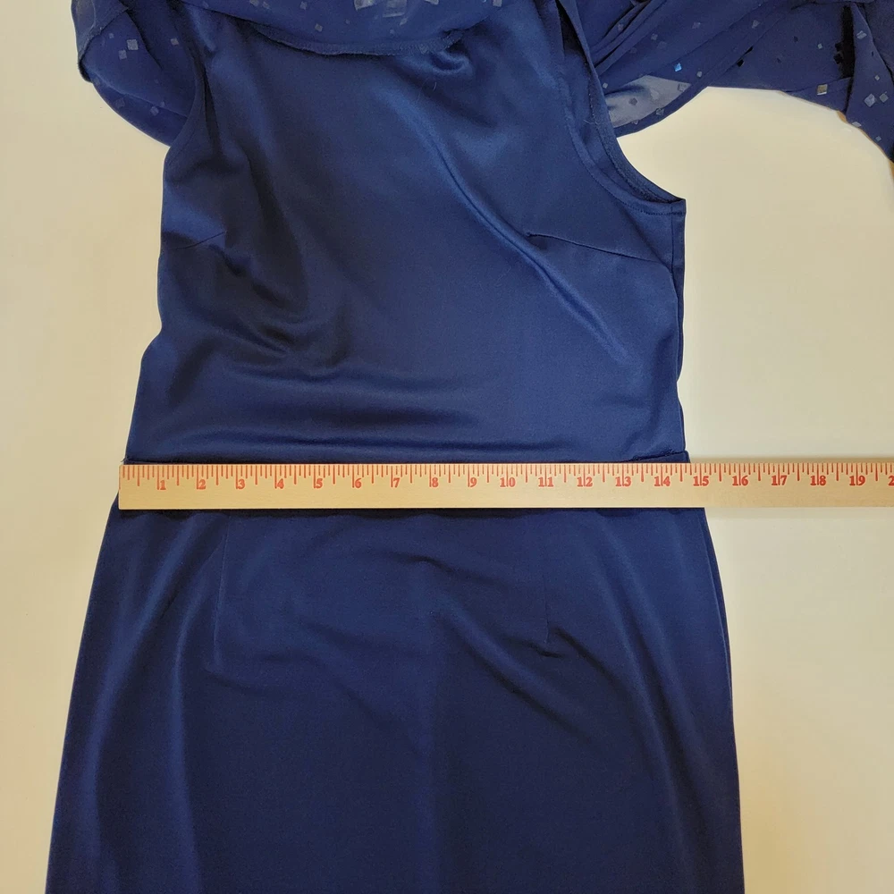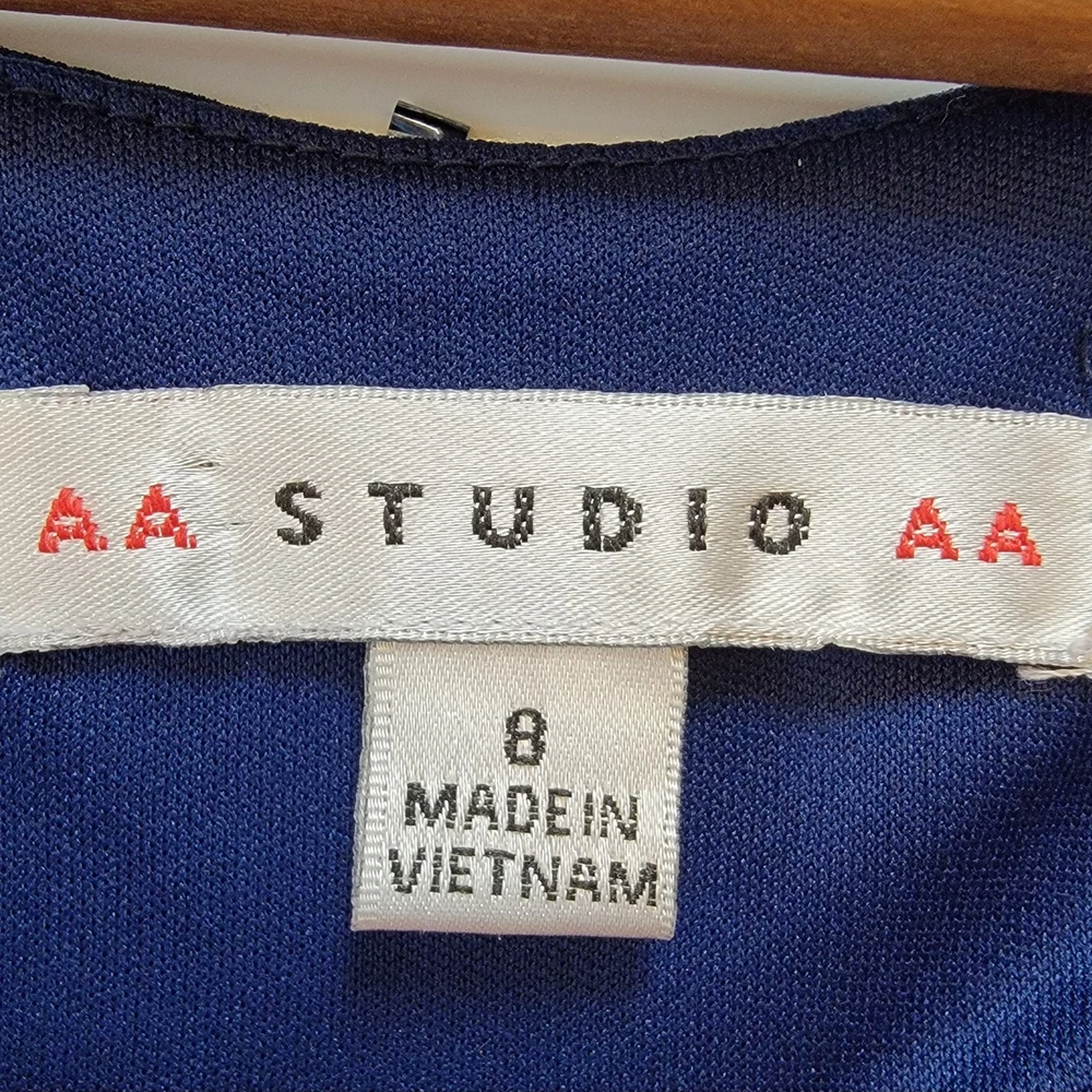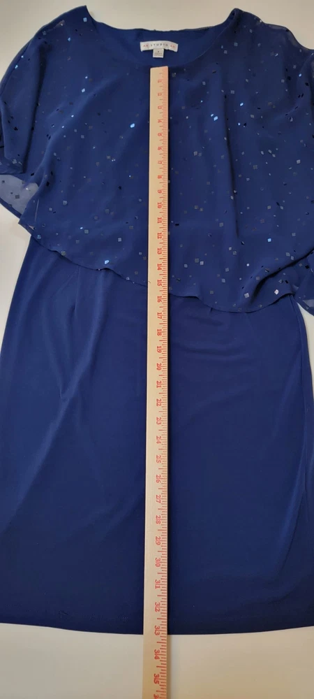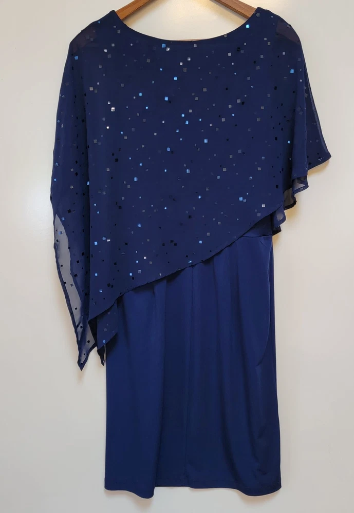 ~The AA Studio AA Elegant Navy Blue Dress features a round neckline, pullover closure, and featuring a sheer sequined overlay. ~The overlay has a cape-like design, draping over the shoulders and upper arms, adding an elegant touch with sequins scattered across the sheer fabric. ~Made from 95% polyester and 5% spandex, the dress is lightweight and perfect for formal occasions like weddings and cocktail parties. ~The dark blue color with sparkling sequin accents adds a touch of glamour, while the sheer shiny material gives it a luxurious look. ~Suitable for various seasons, this dress is sure to make a statement and turn heads wherever you go. ~ Items will need to be paid for within 4 days of purchase, or they will need to be relisted. ~ Shipments will normally go out on same day or next day depending on payment receipt. ~ Combined shipping upon request unless too fragile to do so. ~ I describe to the best of my ability, but not guaranteed, so questions are always welcomed. ~ My Items Come from Estates, Garage Sales, Antique Shops, Flea Markets, Private Sales, Overstocks, & my Own Personal Items, so please look at all the photos carefully. ~ Normally I wipe with a damp cloth before photographing but leave all the deep cleaning to the buyer. ~ Clothing will be cleaned and or steamed prior to posting, Per Ebay Policy ~ Not able to confirm if the items I purchase come from a smoke free pet /free home or business Please refer to and view photos closely before purchasing, for full item condition, details, measurements & any questions you may have as they serve as a major part of my description. Thanks for stopping to take a look, and thanks for your small business support!! Very much appreciated!! If there are any issues with an item you have purchased, please contact me after receiving it so that I can correct it if need be. 1967/CL/052825